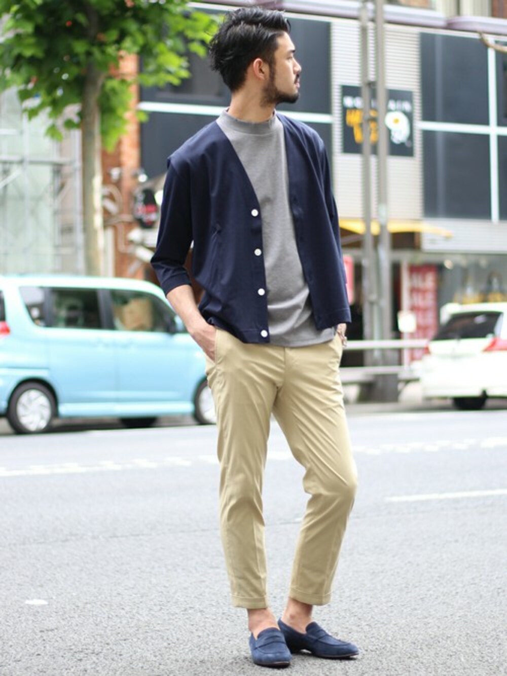 シンプルなカーディガンにモックネックのカットソーを合わせて、爽やかな雰囲気にコーディネートしました。細身のパンツで上品さもプラス。