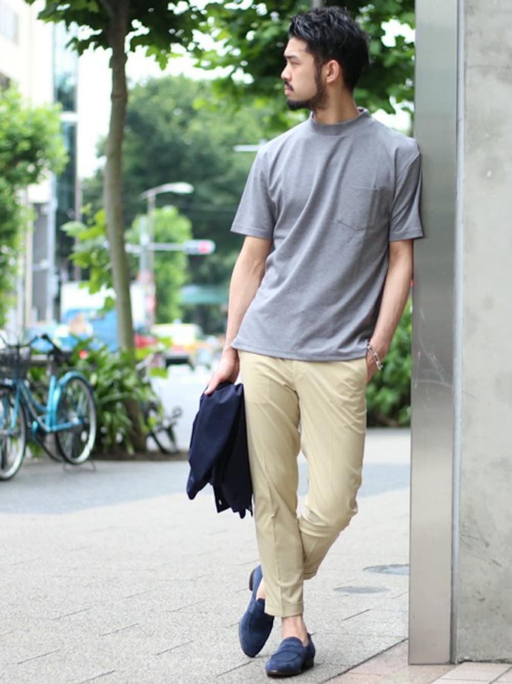 スポーティな雰囲気を持つモックネックTシャツに足元はアンクルパンツ&ロファーで上品にまとめています