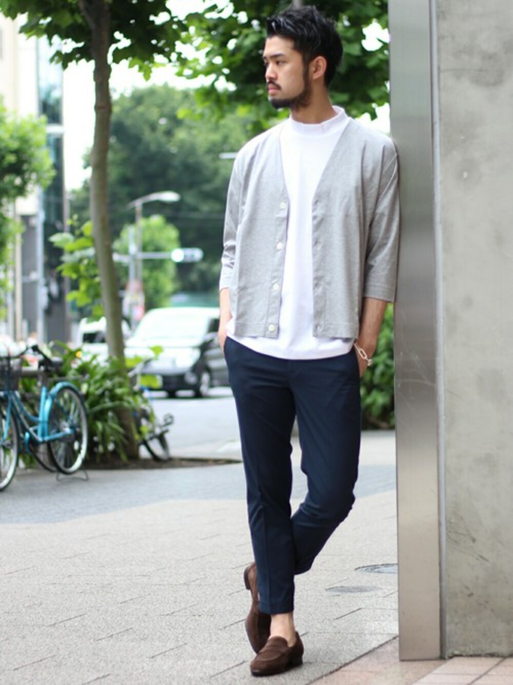 シンプルなカーディガンにモックネックのカットソーを合わせて、爽やかな雰囲気にコーディネートしました。細身のパンツで上品さもプラス。