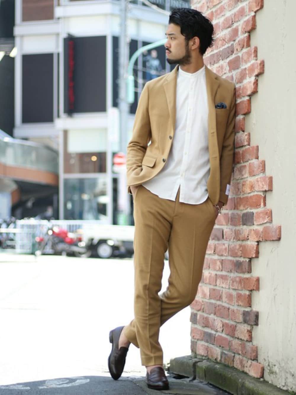 秋冬らしいシーズン感のあるキャメルカラーのセットアップスタイル。クリーンなホワイトのバンドカラーを合せシックな印象に・・・