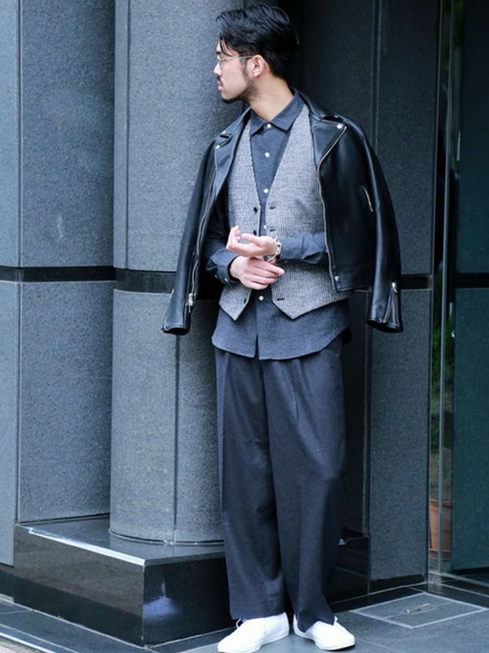 英国ライクなグレンチェック柄を取り入れたコーディネイト。トップスに合わせたマイクロチェックと呼ばれる、一見無地にも見えるような細かいダークトーンのチェックシャツに、千鳥格子のジレを重ねた英国柄の取り入れ方、同色のボトムスに、明るさをプラスしたホワイトのスニーカー。そして、スタイリングを引き締める、レザーのブルゾンで都会的なスタイルを演出します。