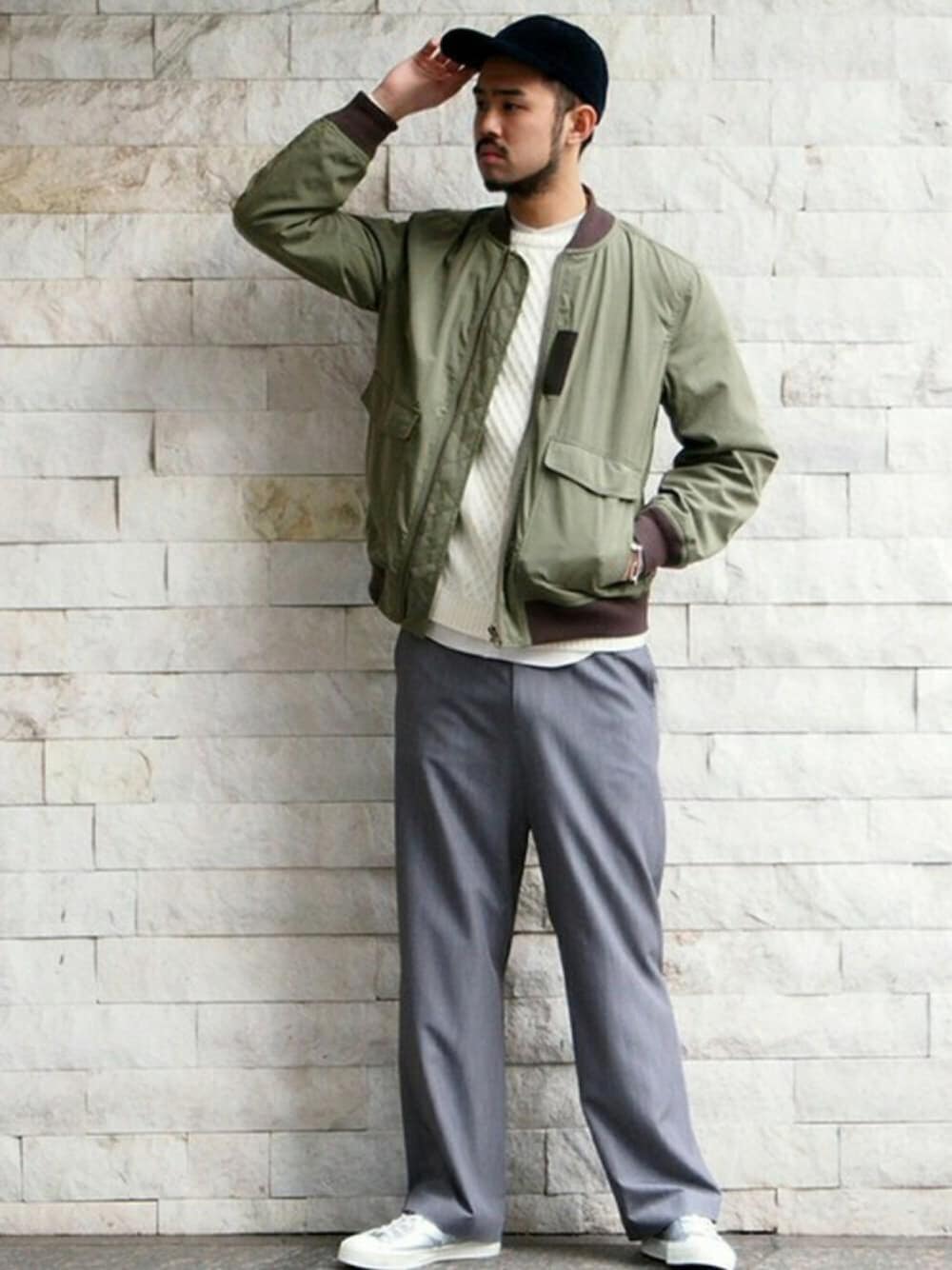 MA-1といえばミリタリーアイテムの印象がありますが、クリーンなホワイトニットに、スラックスをあわせたスタイルに、トレンド感を感じて頂けるルーズフィットに仕上げており、肩を落として着ていただいても良いです。