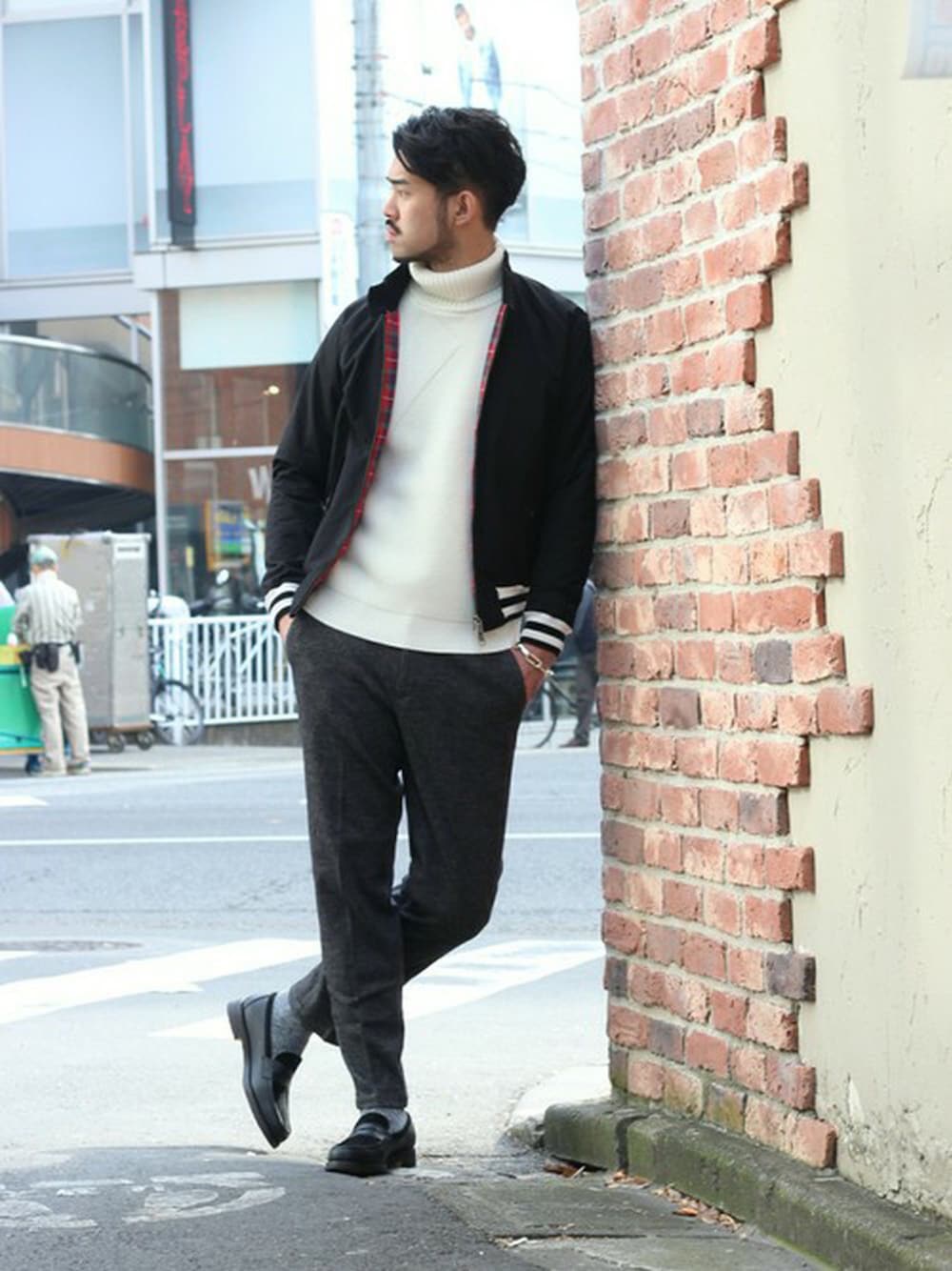 BARACUTA×EDIFICE。モノトーンカラーをベースに、スポーティなホワイトラインを袖口、襟元に当て込みシンプルな大人らしい印象に仕上げています。裏地のブランドアイコンのチェック柄はそのままにヘリテージなイメージのあるBARACUTAをモードな印象に昇華しました。