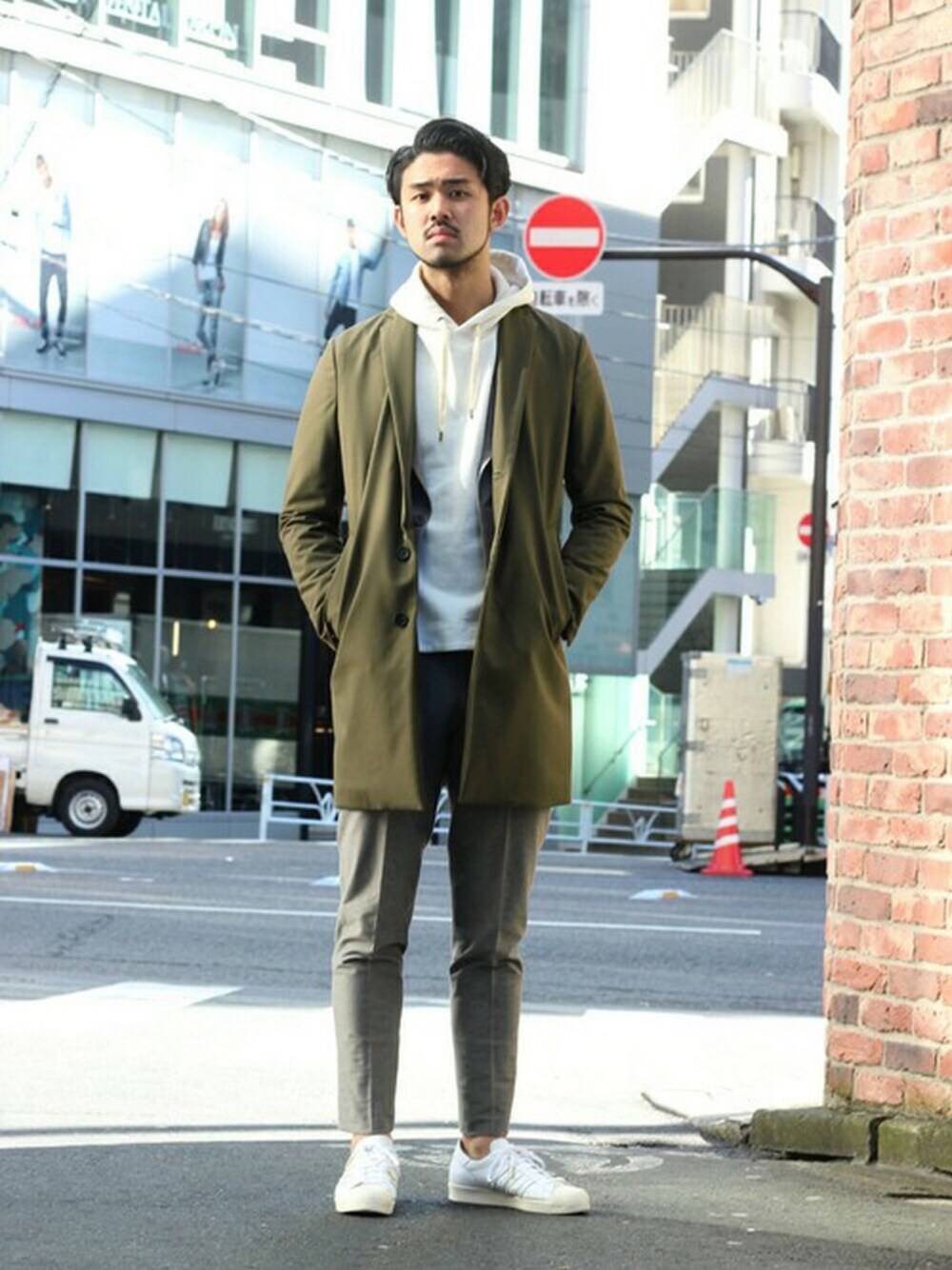 カーキのチェスターにはクリーンな白系のアイテムを選び、EDIFICEらしくスタイリッシュにまとめました‼︎