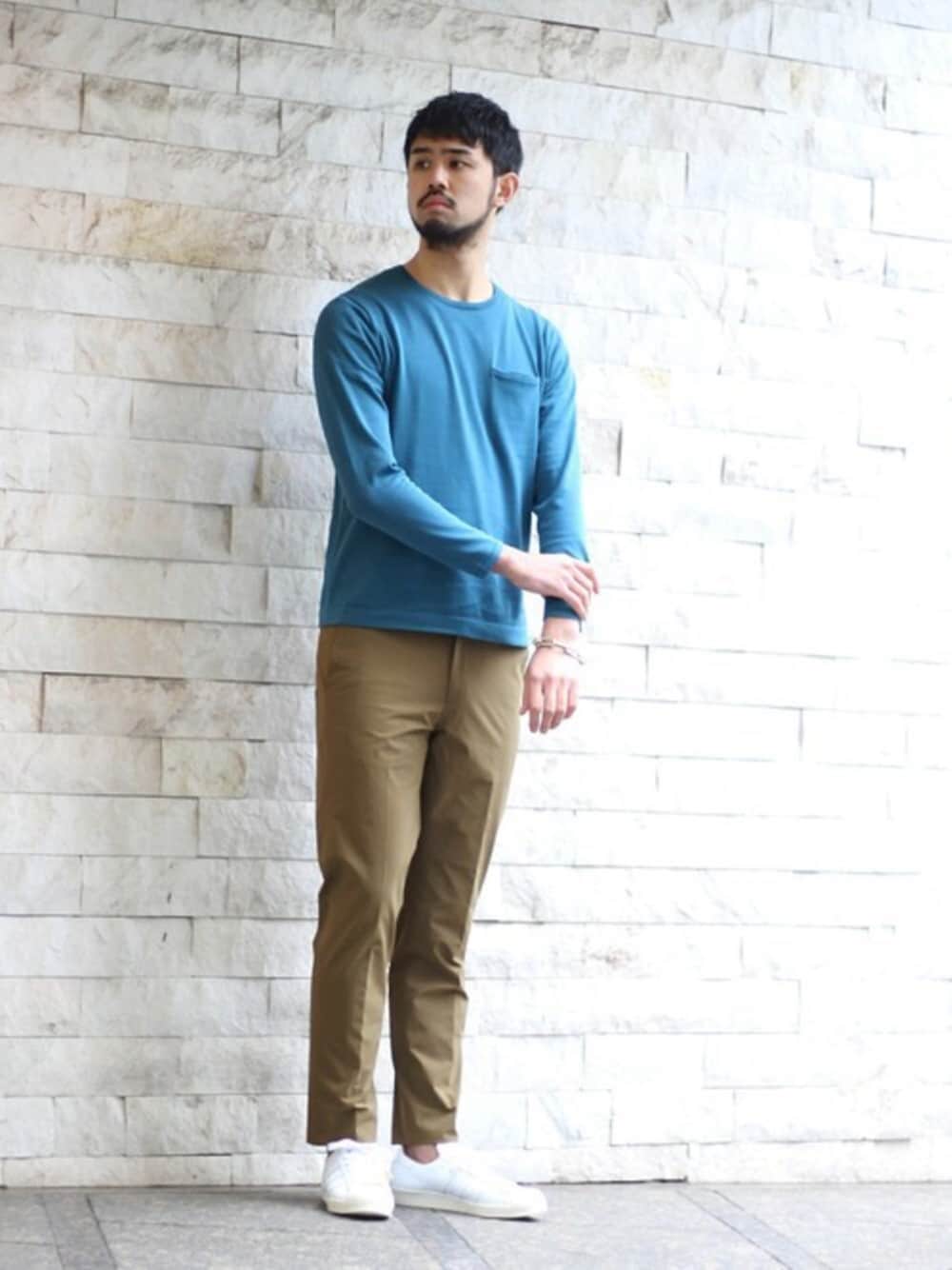 春らしいターコイズブルーが映えるニットはポケT仕様で、幅広く着回しができます!