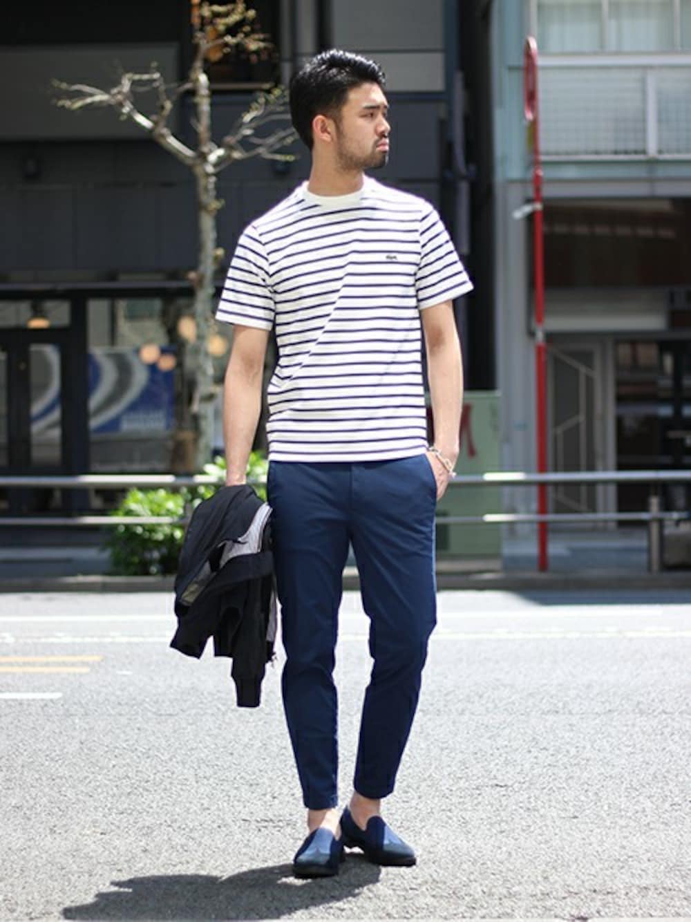ラコステのネイビーボーダーのカットソーをメインに全体的にネイビーカラーで統一したコーディネート。インナーとしても重宝するアイテムは、今時期には、一重アウターと合わせた軽快なスタイリングにオススメです!