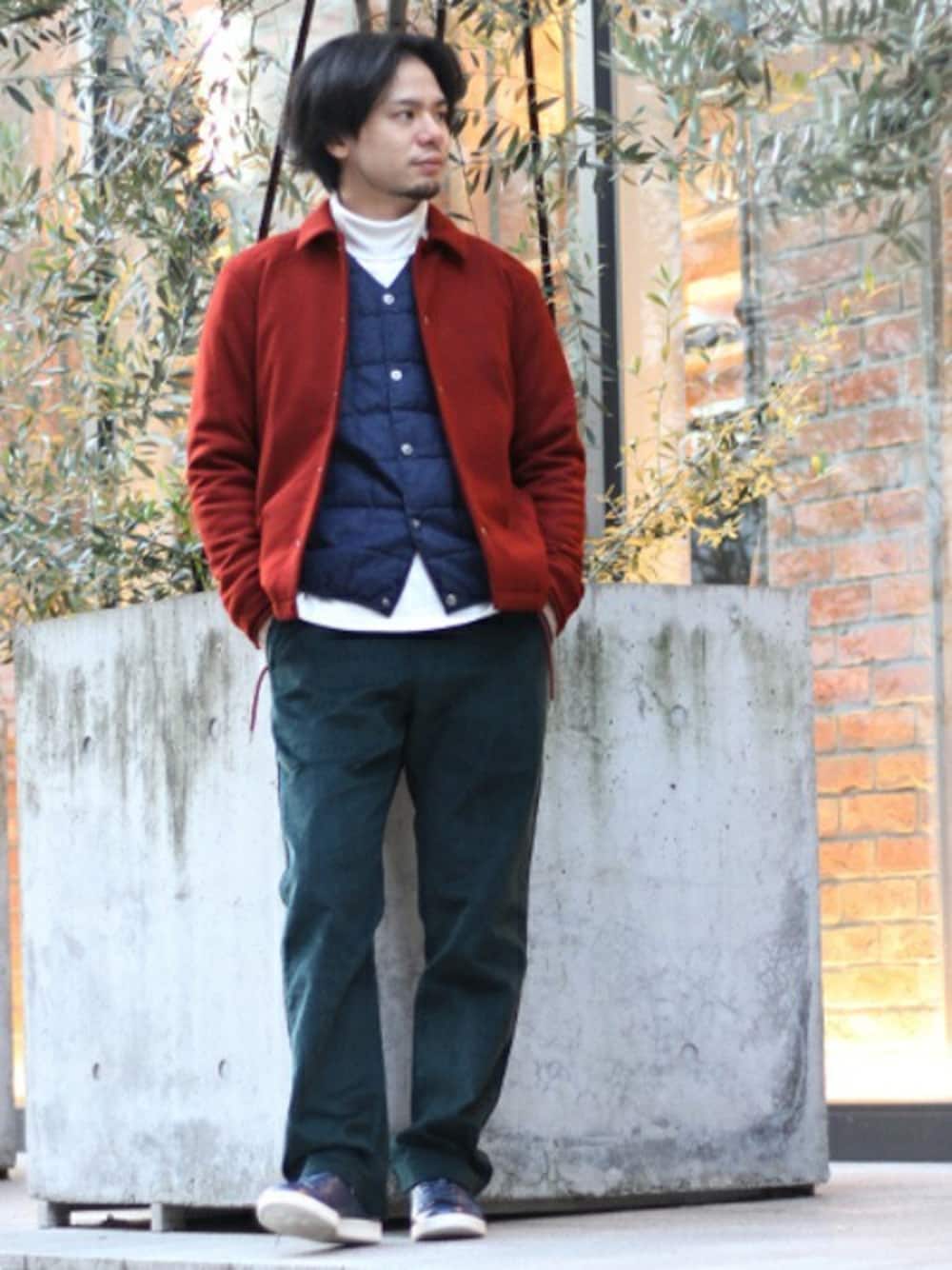 Luminary wool コーチジャケット。中綿の入ったコーチジャケットに、TAIONのインナーベストを差す事で保温性を高めました。スタイリッシュな着こなしにも防寒性を兼ね備えたコーディネートに。
