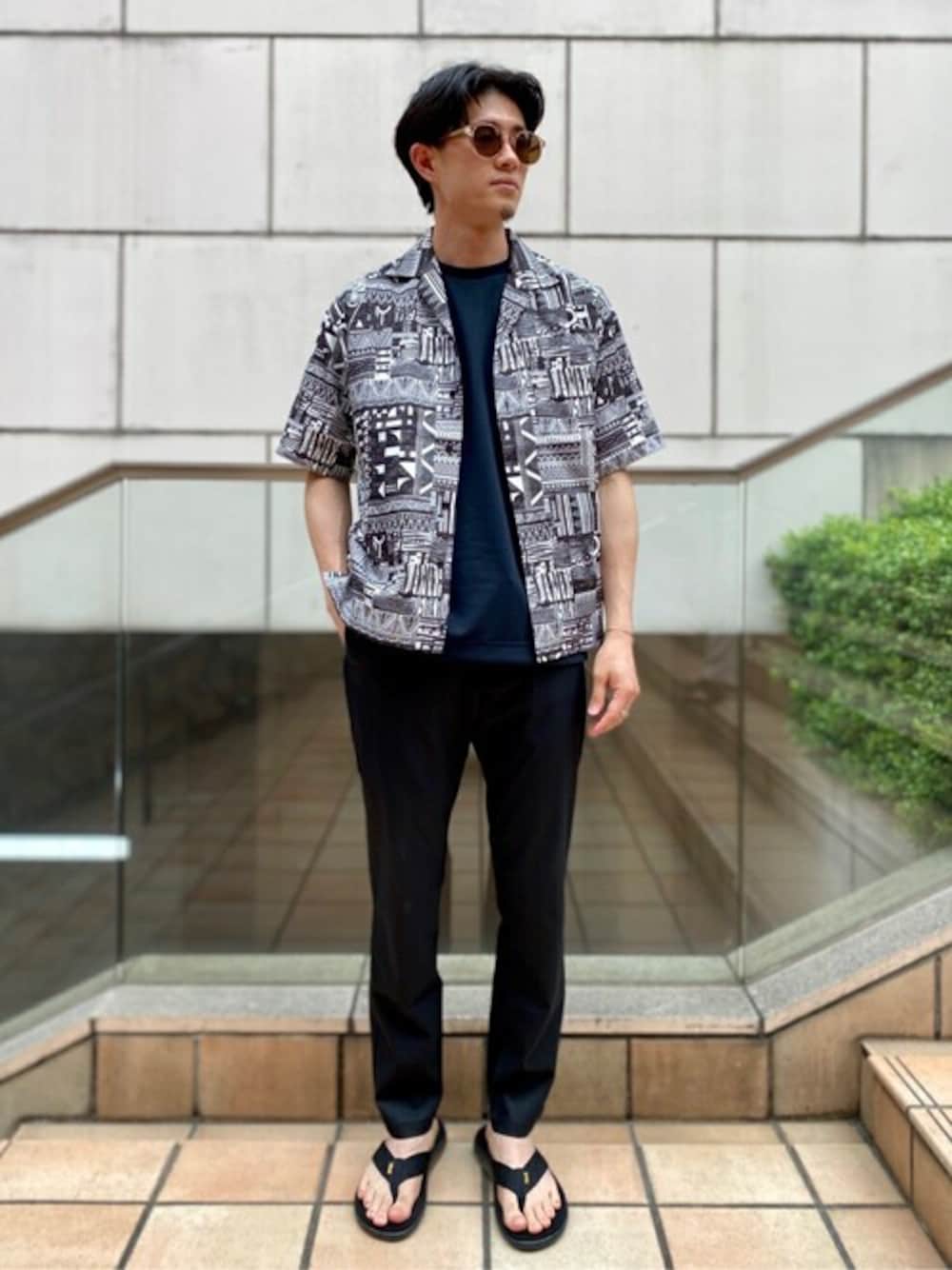 【クレイジーバティックオープンカラーシャツ】 イージーケアなポリエステル素材で、真夏のクリーンなスタイルに取り入れるとぐっと今年らしさを楽しめる仕上がりです。 普段サイズ:M / 着用サイズ:M サイズ感:程よくゆとりのあるシルエットです。 素材感:サラッとした素材感です。 着心地:軽くて涼しいです。