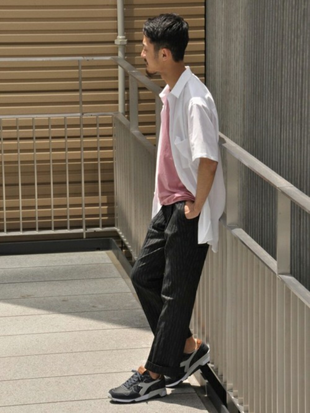 モダンで上品な雰囲気漂うシャツスタイルには、挿し色カラーでポップな印象をプラス。
