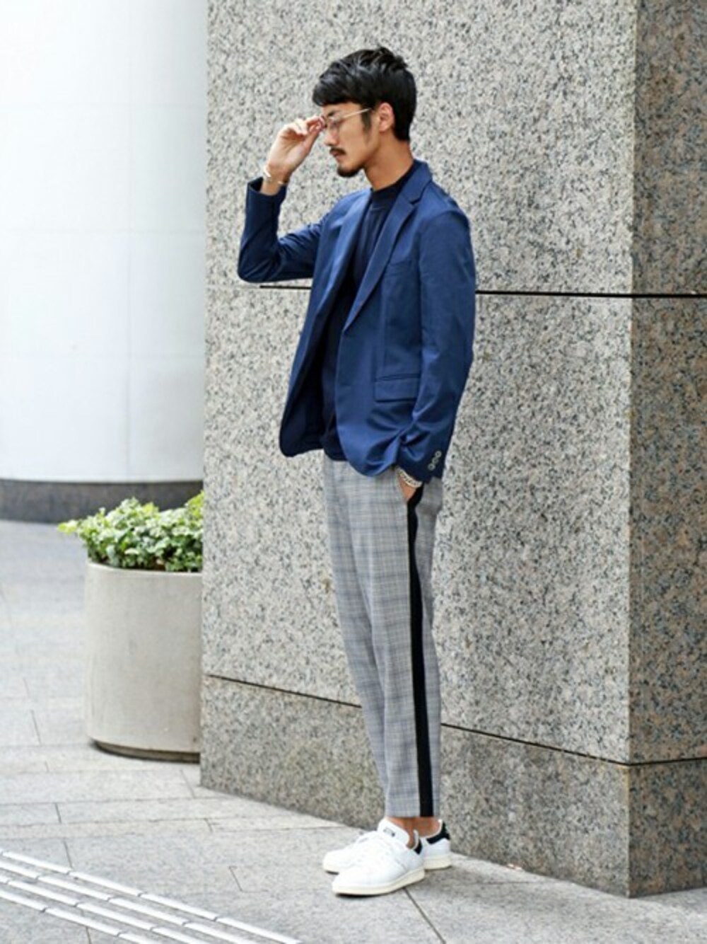 伸縮性のあるジャケットは着丈も程よく短く、もちろんスリムなシルエット。カラーも上品なブルーで、インナーのネイビーとの濃淡を楽しんだスタイリング。