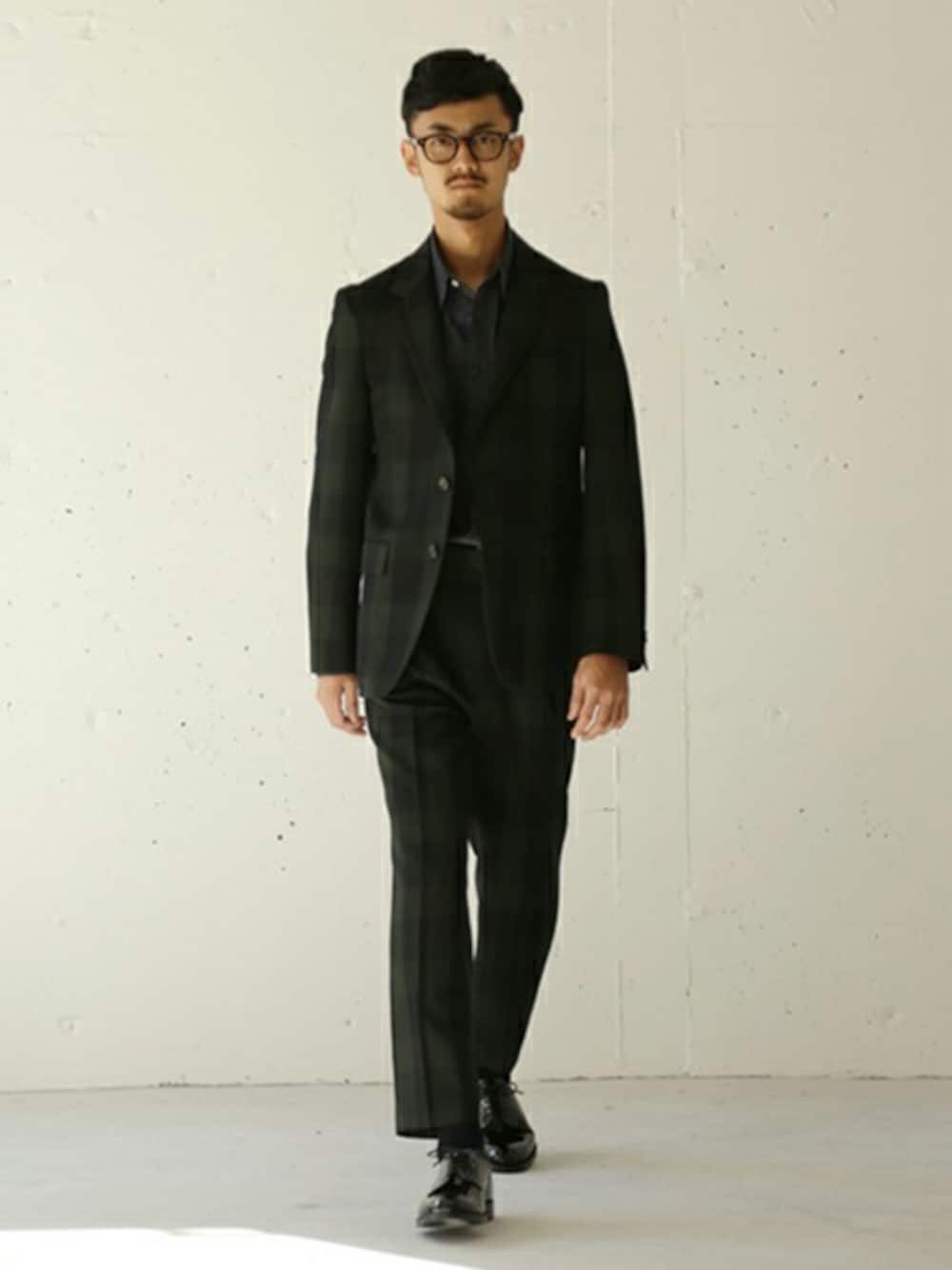 ウール素材特有の、柔らかな風合いのビッグチェック柄が目を惹くセットアップスタイル。グリーンベースでトーンを落としたカラーリングなのでシックで品のある印象になります。