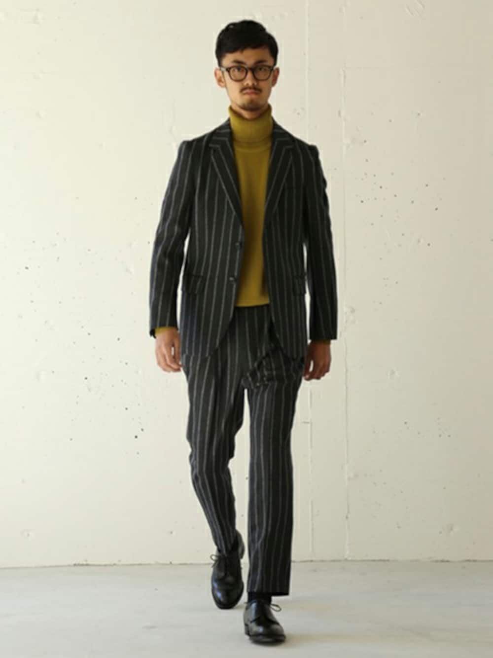 ウール素材特有の、柔らかな風合いのチョークストライプ柄が目を惹くセットアップスタイル。インナーにマスタードカラーのタートルネックニットの挿し色がポイントです!
