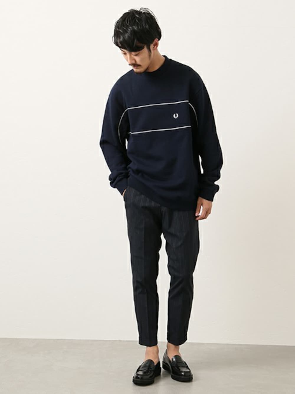 「FRED PERRY」との別注モデルは、90年代に生産していたロゴ入りスウェットをベースに首元をモックネックにアレンジ。ネイビーカラーでまとめることで都会的なスポーツMIXスタイルを演出してくれます!