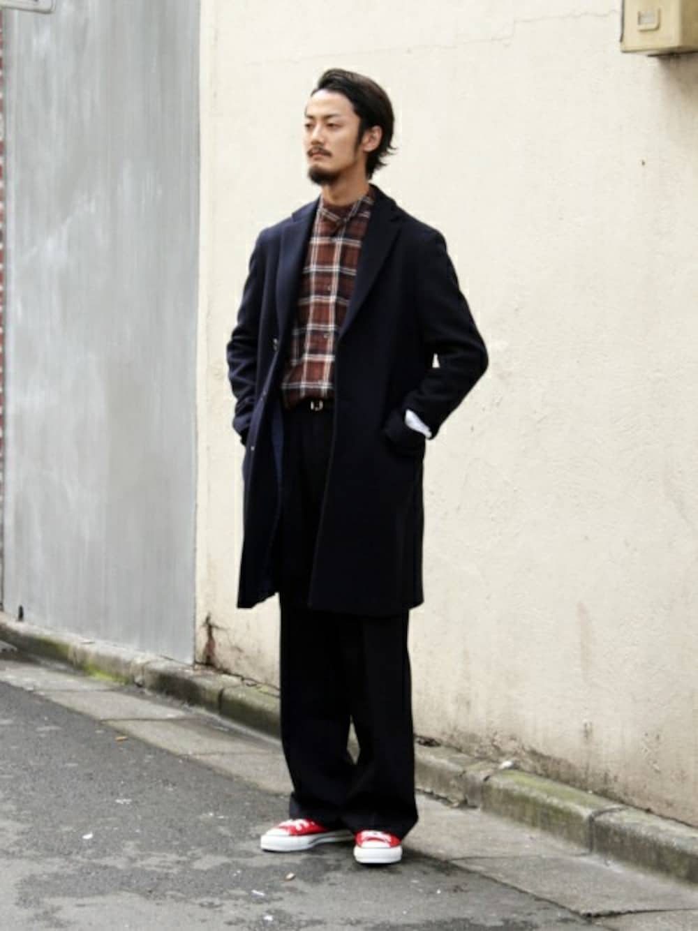 Super120s メルトンチェスターコート コートとパンツをネイビーで統一しつつインナーのチェックシャツと赤のスニーカーで抜け感を出したカジュアルスタイルです。