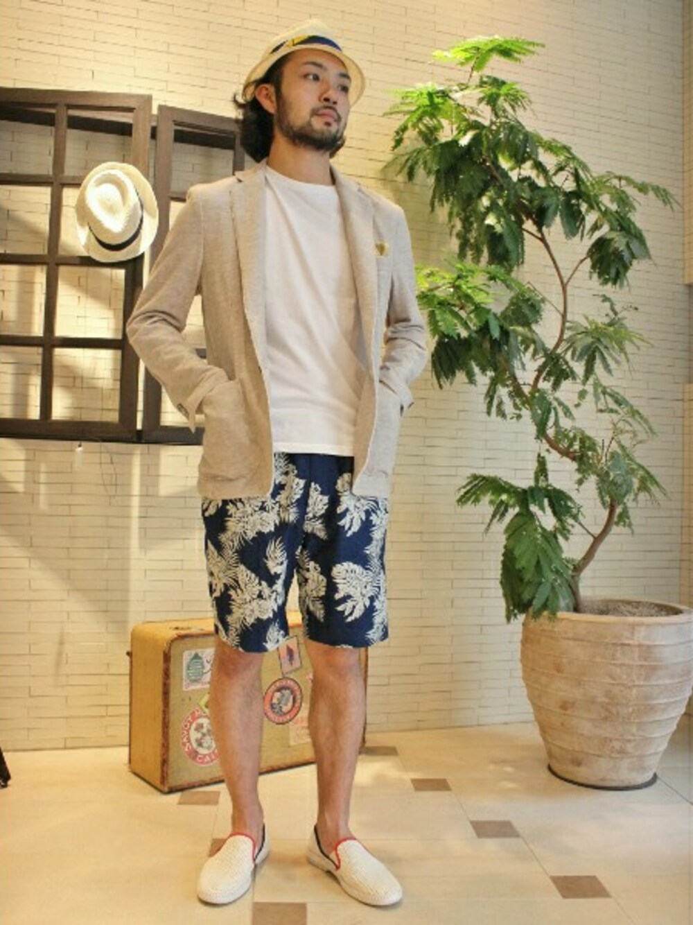 上品なアイボリーのジャケットにリーフ柄のショーツに合わせたリゾートスタイル。