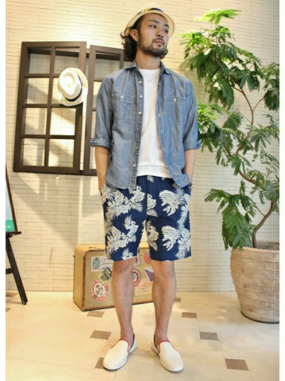 清涼感のあるインディゴシャツにリーフショーツをあわせたリゾートスタイル。