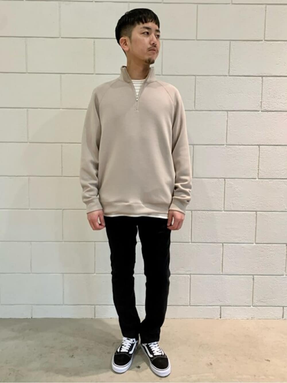 ダンボール素材のハーフジップスウェット。 光沢のある生地感が品の良さを出してくれます。