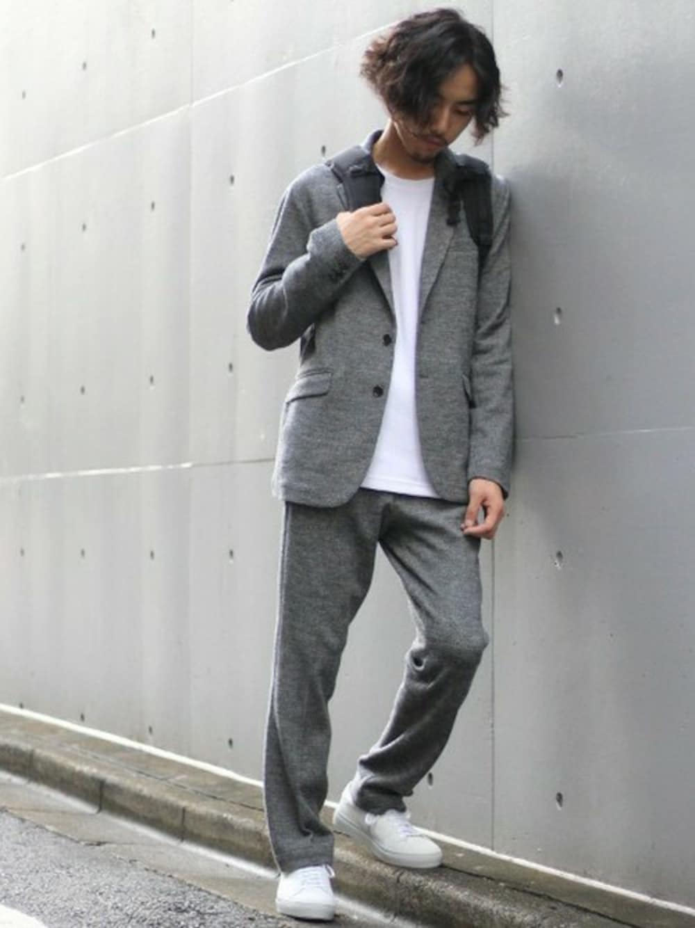 トレンドのセットアップスタイルはバックパックやスニーカーでハズシ、適度なカジュアル感を意識しました。
