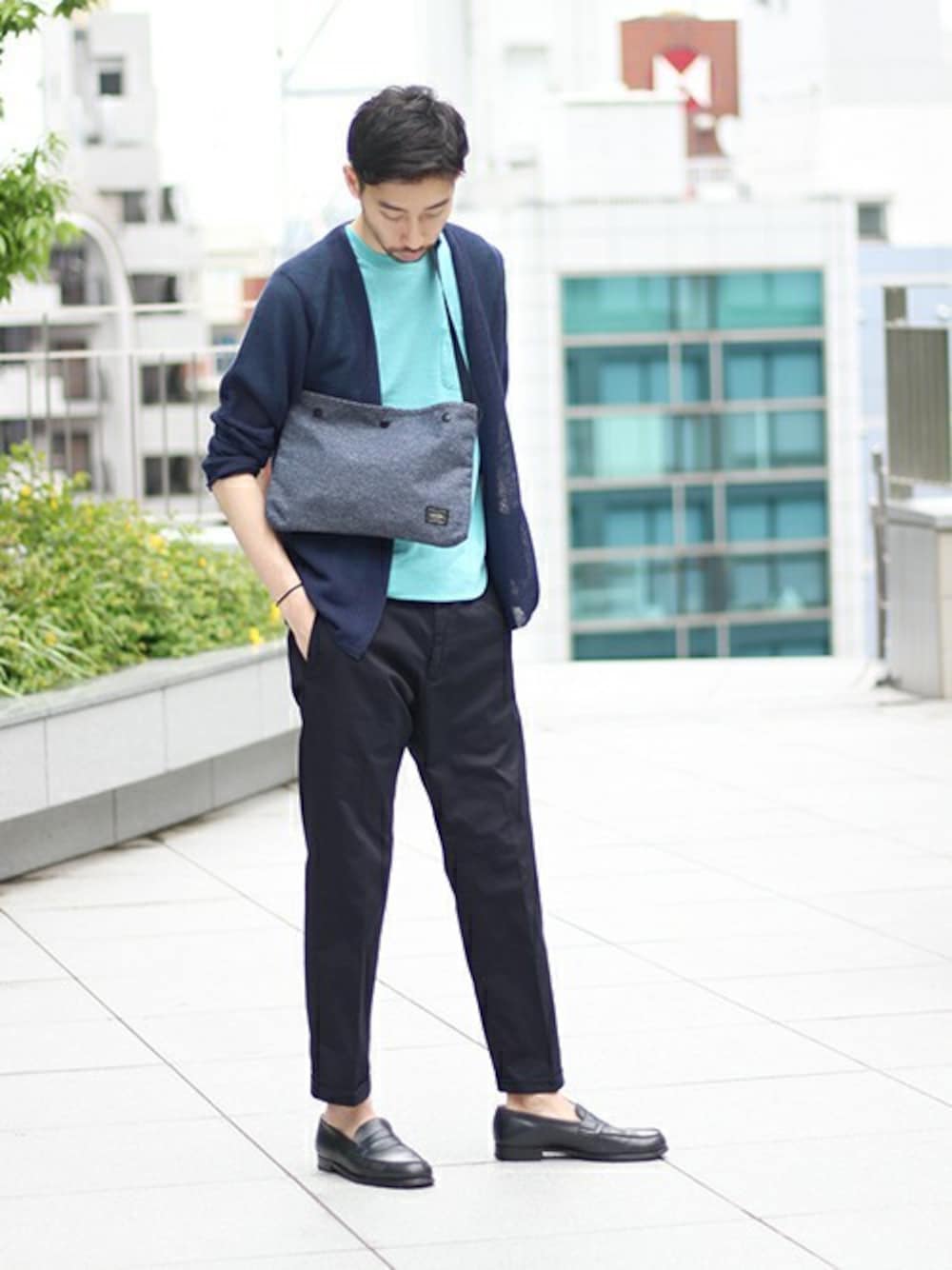ネイビーコーデのアクセントとなるのは、LOWERCASE×PORTER×EDIFICEの別注サコッシュ。コンパクトなサイズ感が休日にぴったりです!