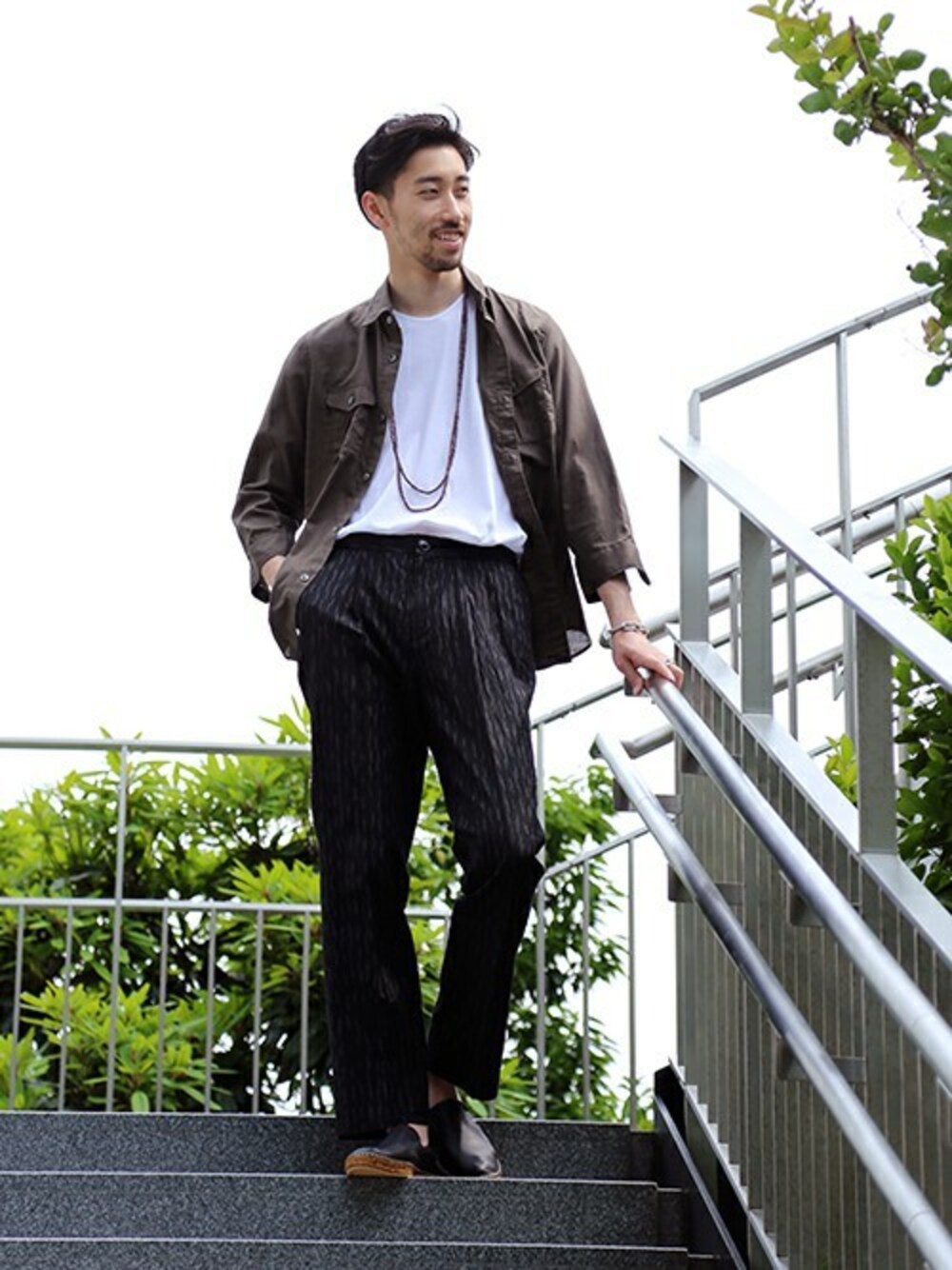 骨太感のあるミリタリーシャツも、薄手で透け感のあるローンコットンとリネンの混紡素材なら、ブラウスよりも上品です。