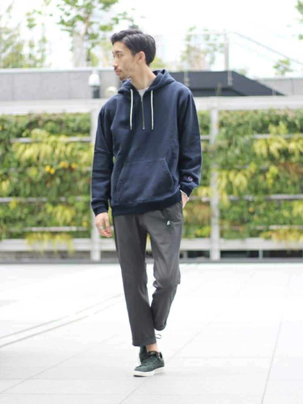 「Champion」との別注パーカーはトレンドのハーフジップタイプのプルオーバー型で提案。GRAMICCIのストレッチパンツにスニーカーを合わせて更に軽快さをプラスしました!