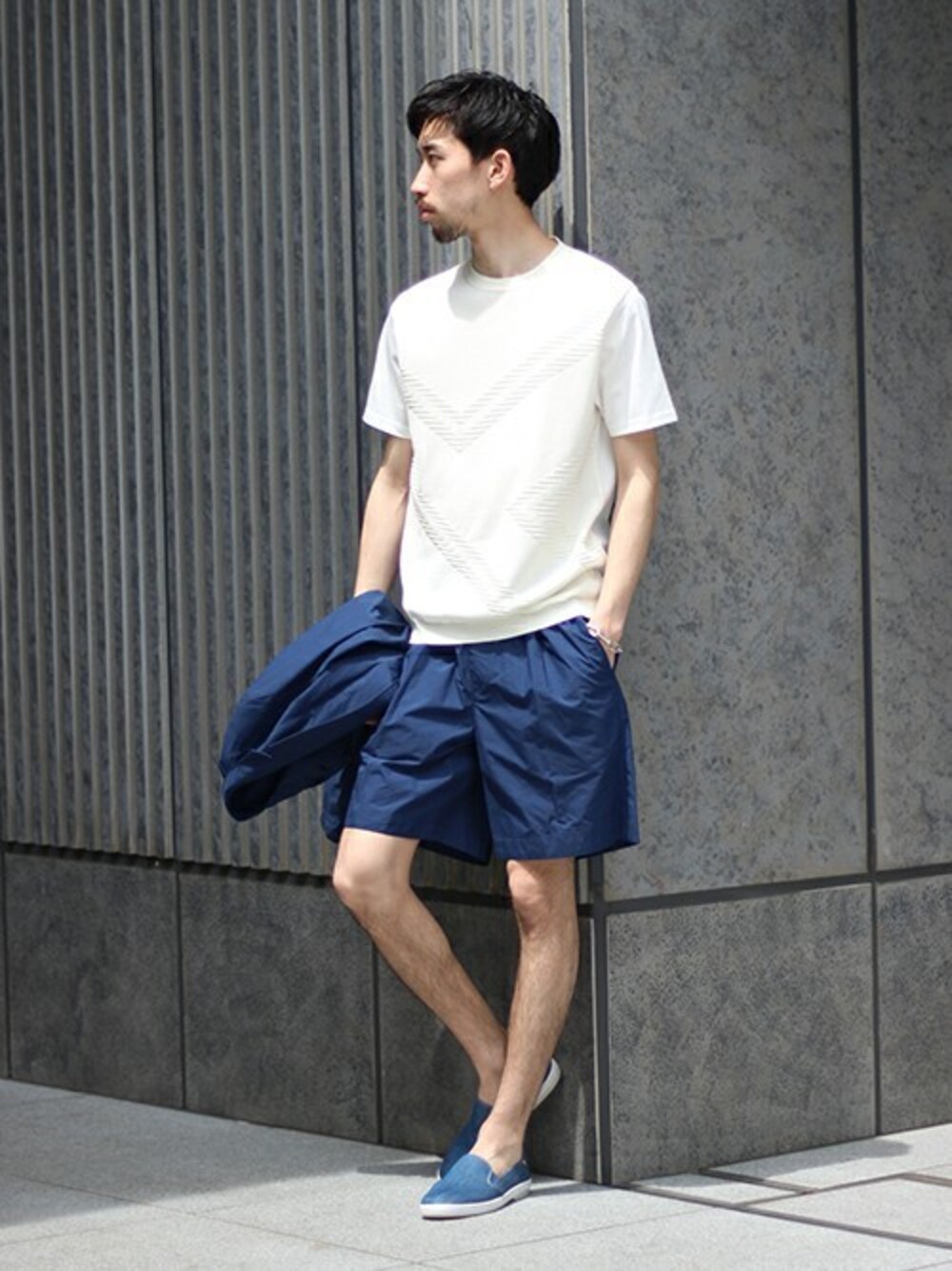 前見頃に編み組織を組み合わせた地柄、袖、後ろ見頃はシルケット天竺の上品な光沢感のあるポンチを使用したカットソーは、シンプルなデザインでありながらも存在感を発揮します。ホワイト×ブルーでまとめたクリーンなスタイリング。