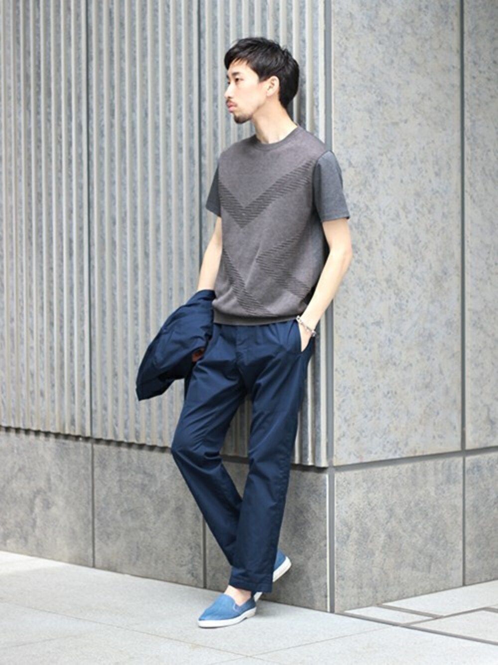 セットアップスタイルのインナー使いとして使用しているカットソーは、編み組織を組み合わせた地柄がポイントとなり、さりげないアクセントを与えてくれます!