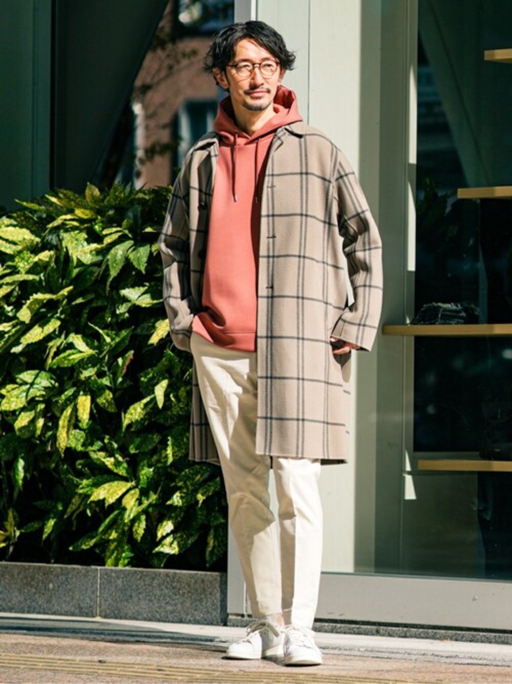 TERAIのステンカラーコート「Super120’s モッサ チェック ウール ステンカラーコート」を使ったコーディネート