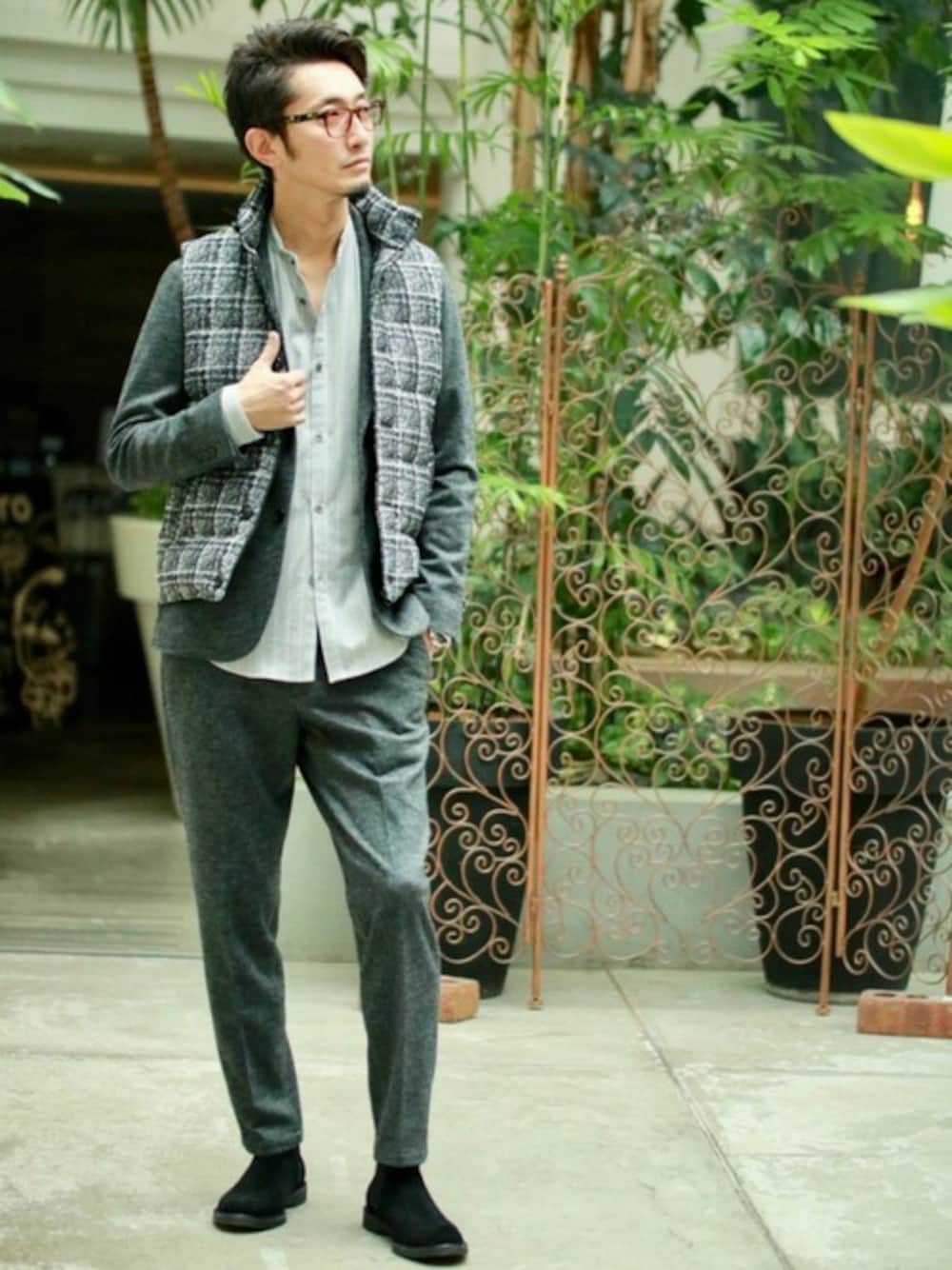 いつもはカジュアルに合わせるベストを今季はドレスライクな着こなしにアレンジ。ブリティッシュ調のチェック柄にグレイッシュなモノトーンの合わせで、白×黒とはまた違った上品なスタイルに仕上がります。