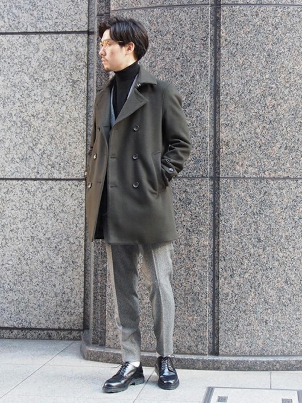 ジャケットがスマートに隠れるくらいの着丈が魅力のメルトントレンチコート。カジュアルシーンからビジネスシーンまでスタイリッシュなコーディネートを。セットアップスタイルは、シックな色でまとめることで、コートの上品なカーキがより引き立ちます。