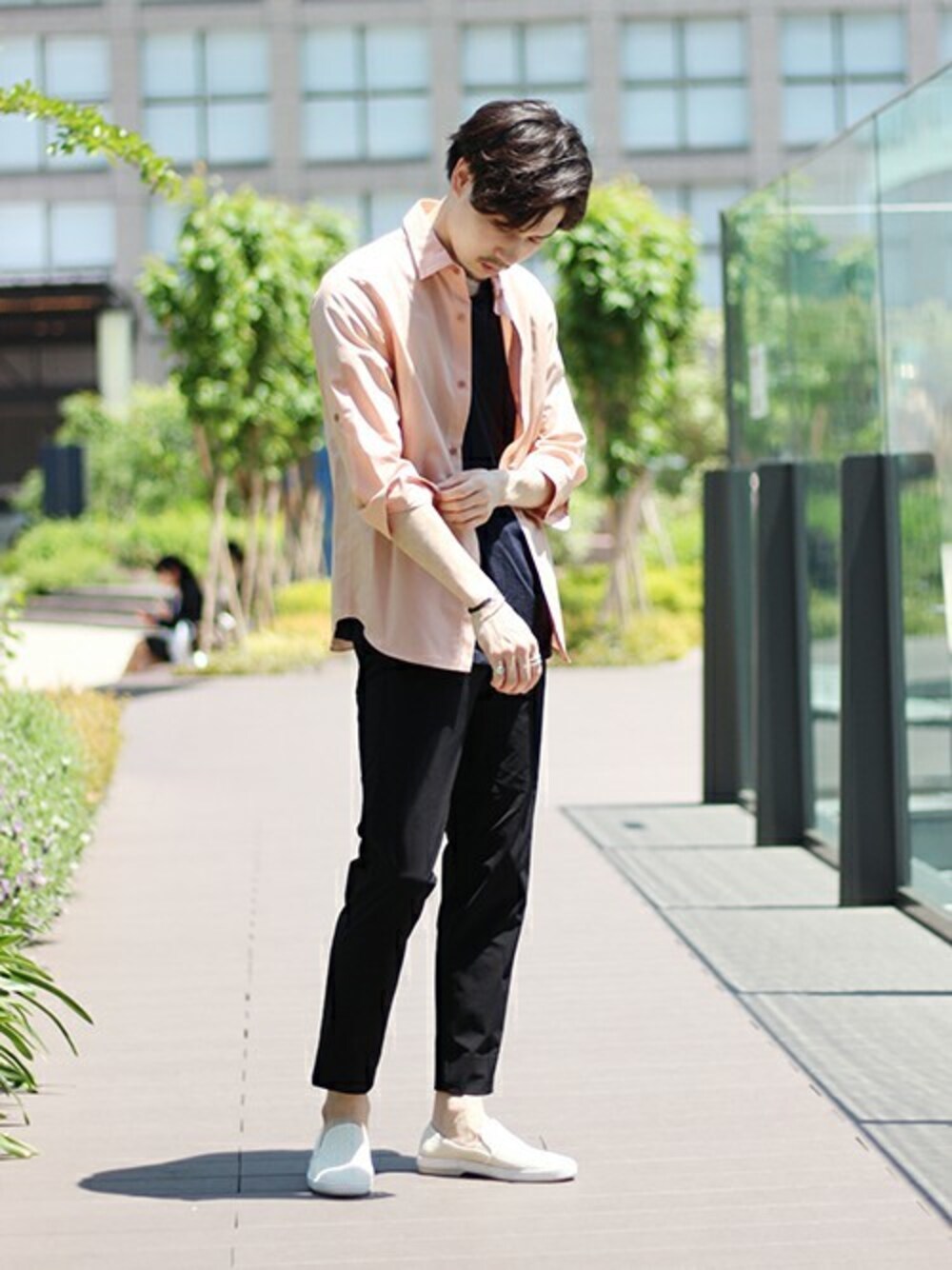 ダークートーンのコーディネートにピンクの7分袖シャツがポイントとなったスタイリング。シャツや足元のスリッポンが、柔らかい雰囲気を演出してくれます!