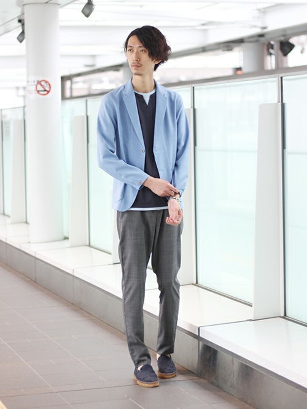 ブルーの薄さも絶妙なペールカラーのジャケットをグレーパンツを合わせることでシッックな合わせに。ネイビーのインナー、シューズを合わせて統一感をだしているところもポイントの一つ。