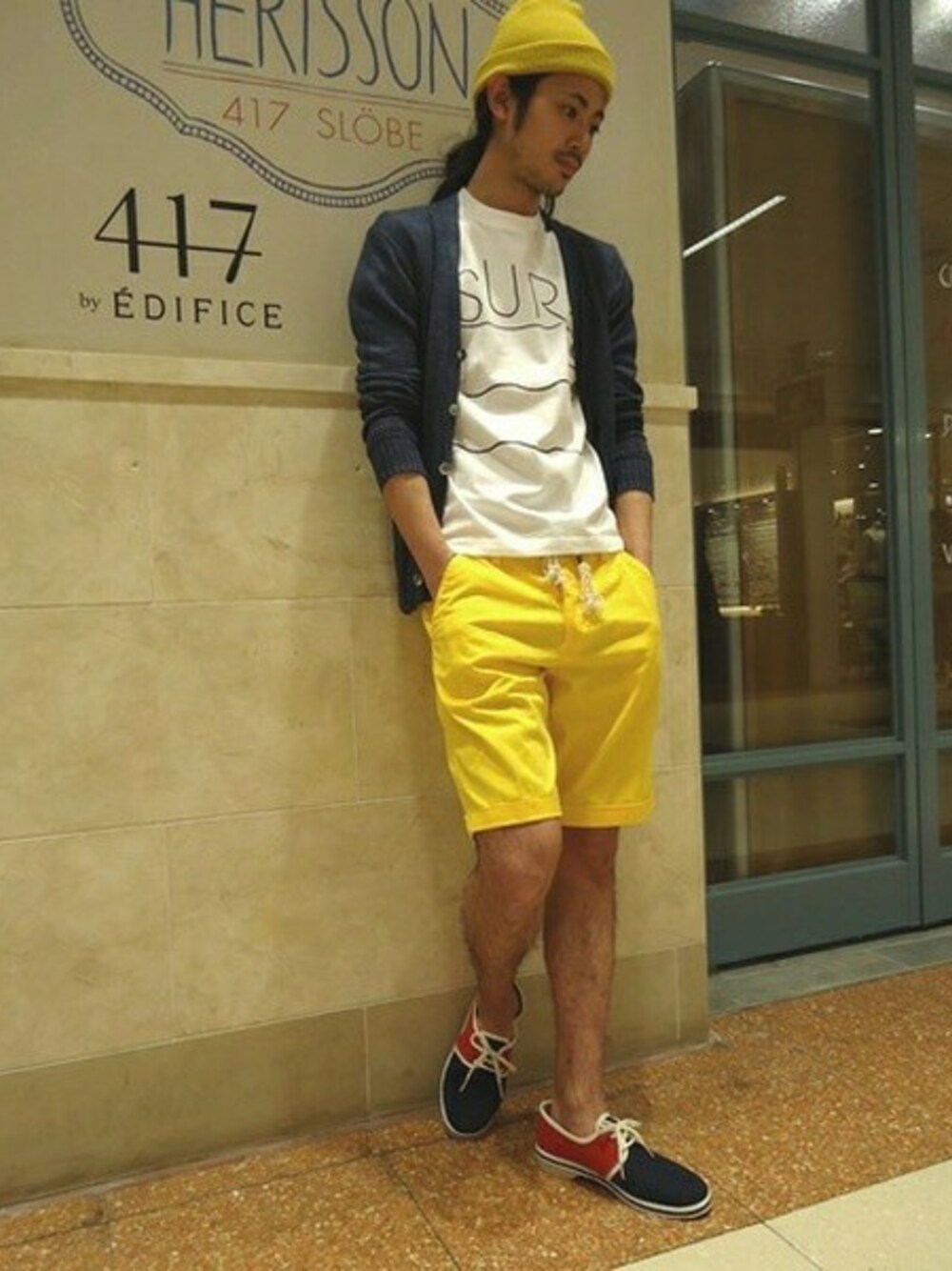 トレンドカラーを取り入れたサーフスタイル。 袖をまくって軽快さを演出し、リラックス感のあるスタイリングです。