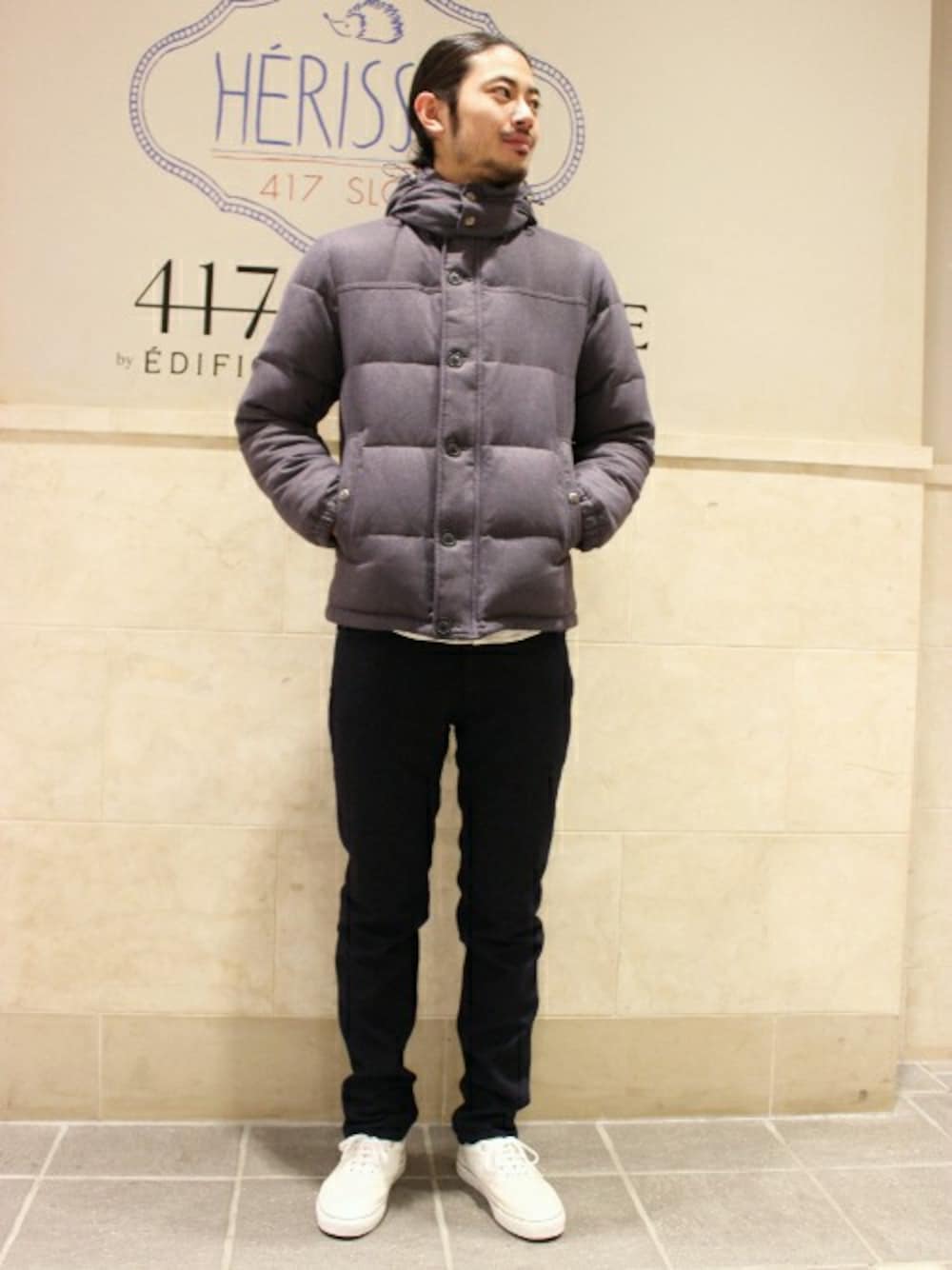 417 by EDIFICE渋谷店スタッフ8のダウンジャケット/コート「◇ヘリンボーンフードダウンブルゾン」を使ったコーディネート