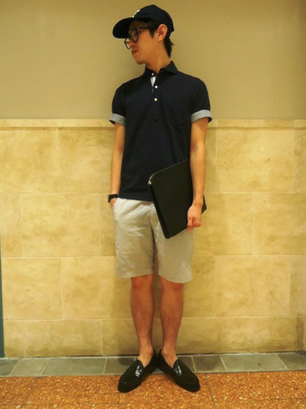 清潔感あるポロシャツとショーツを組み合わせ夏らしい涼しい印象と、レザーの小物を使い大人の雰囲気漂うスタイリングを組んでみました。