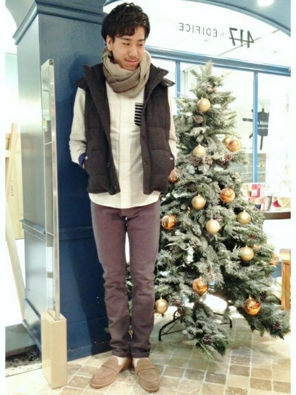 417 by EDIFICE立川店のダウンベスト「ヘリンボーンフードダウンベスト」を使ったコーディネート