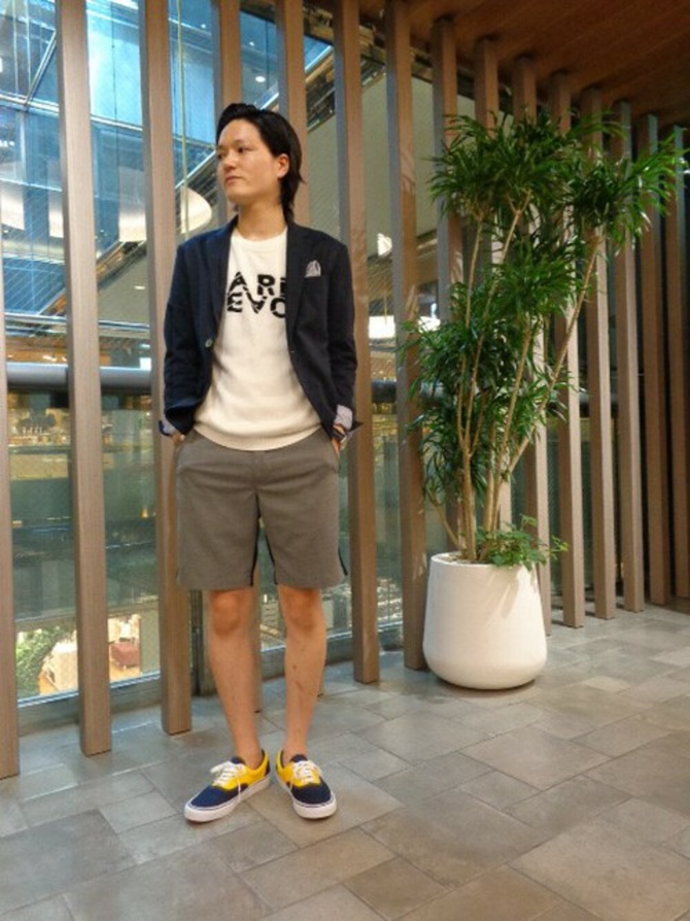 サマーニットにジャケットを羽織り、トロピカルショーツで上品なコーディネートに。シューズにVANSを合わせ、417らしい着こなしにしました。
