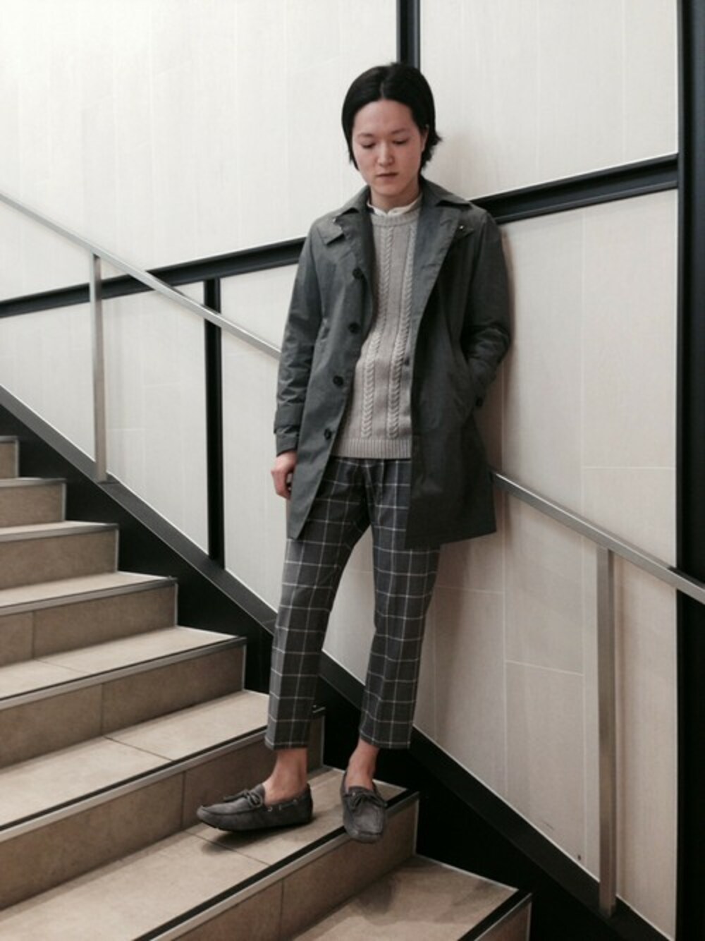グレーをベースにしたキレカジスタイルです。全体的に落ち着いた雰囲気ですが足元をインソックスで合わせる事でより季節感を出しております