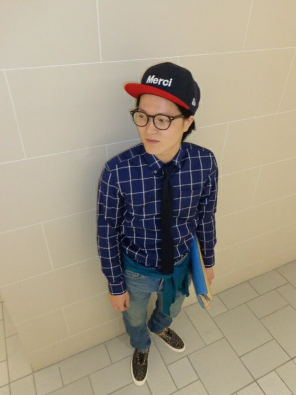 シャツにタイドアップし、ニットを腰巻き。シティ感のあるコーディネートにニューエラのキャップとバンズでストリートをミックスし417らしい着こなしです。