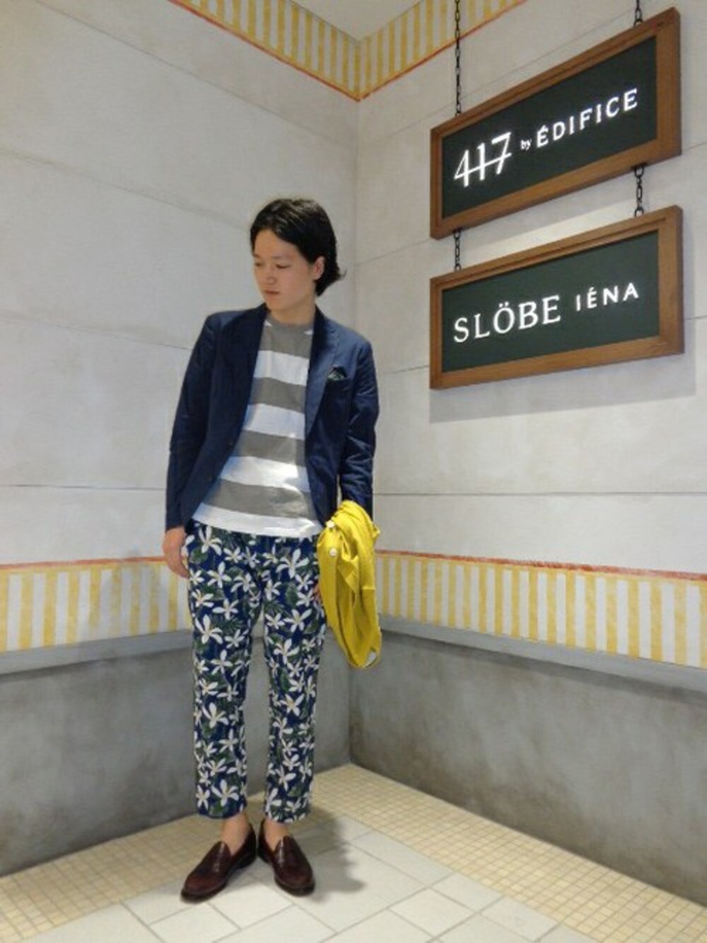 キレイめのジャケットにプレッピーな花柄パンツを合わせ、程良い抜け感のあるコーディネートにしています。
