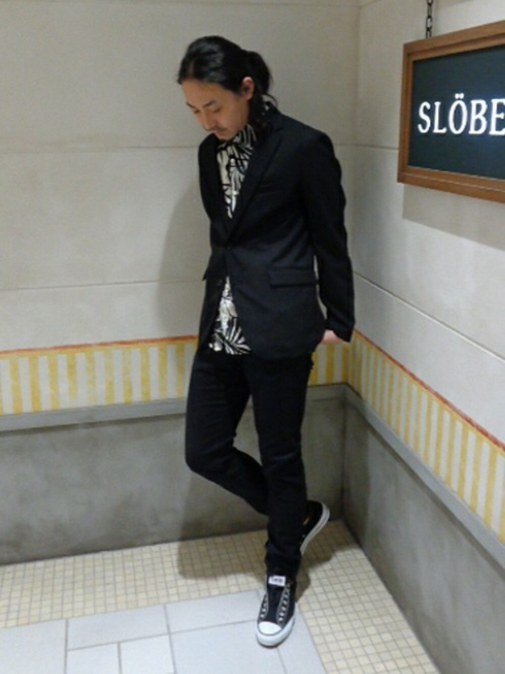 アロハシャツにジャケットを合わせモノトーンで統一。アロハをモダンに着こなす大人コーディネートです。
