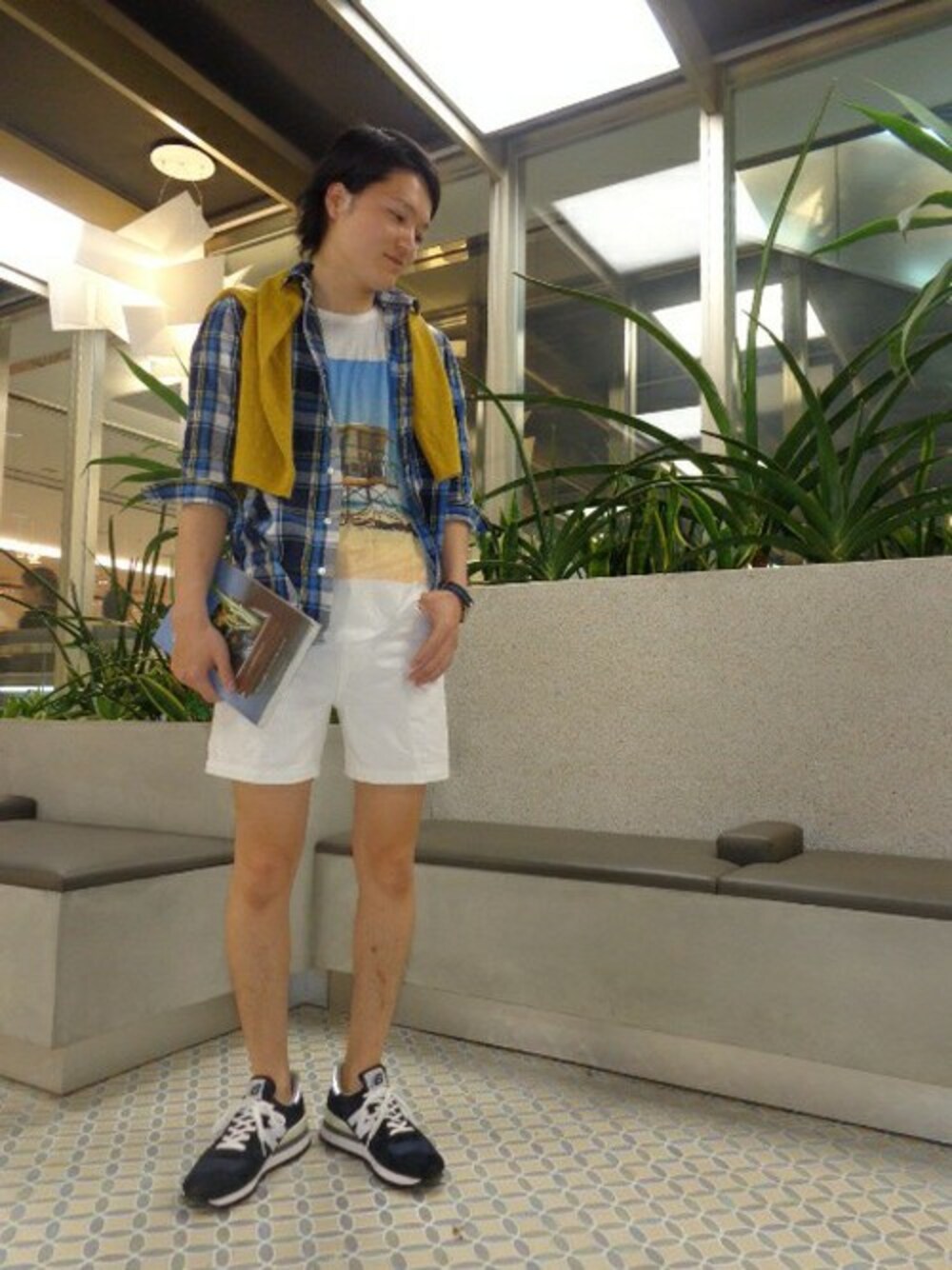 白で統一感のあるコーディネートにブルーのマドラスチェックシャツのアクセントが爽やか。