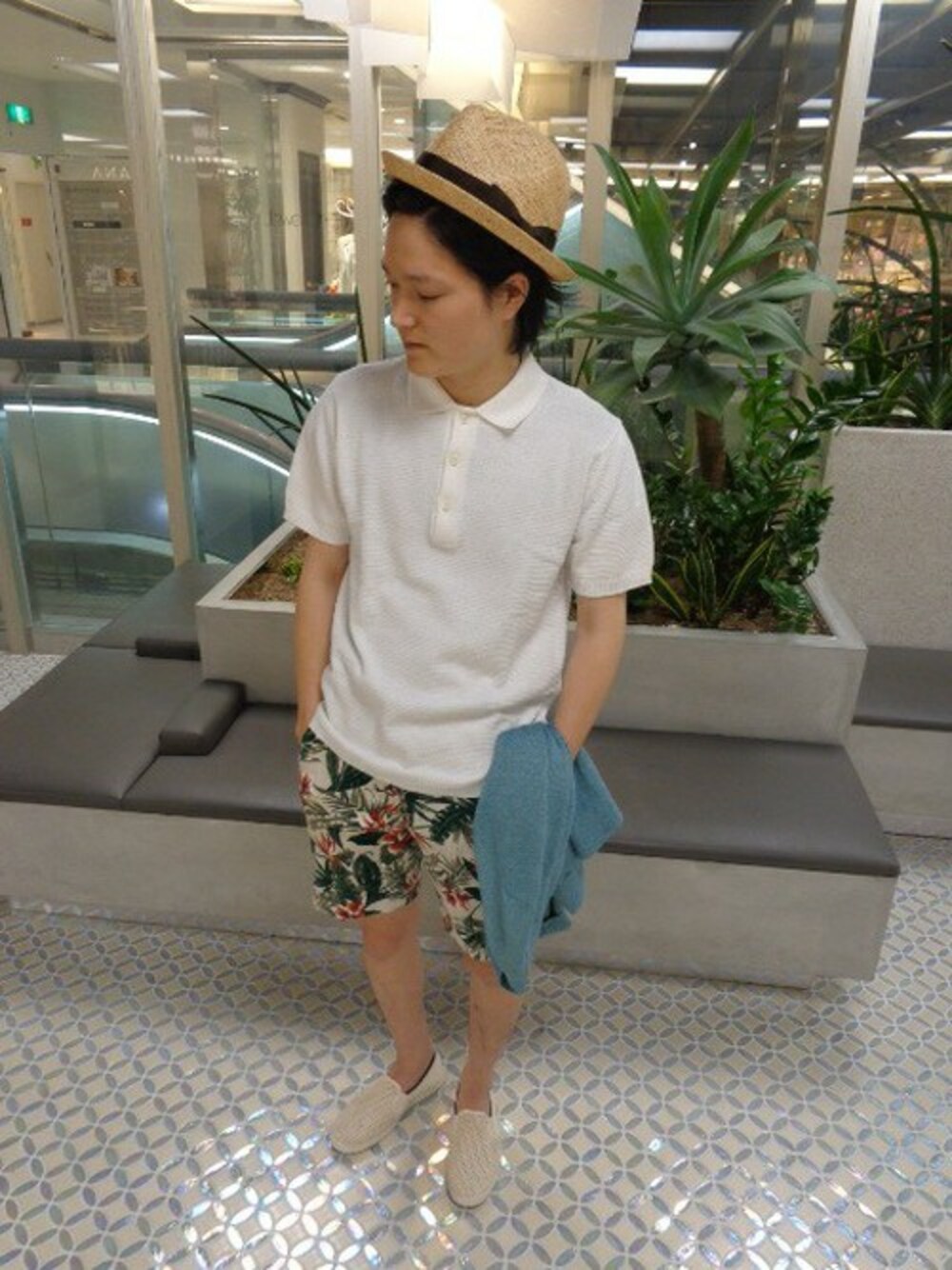 白のニットポロにアロハイージーパンツでリゾート感を演出した夏場に最適なカジュアルコーディネート。
