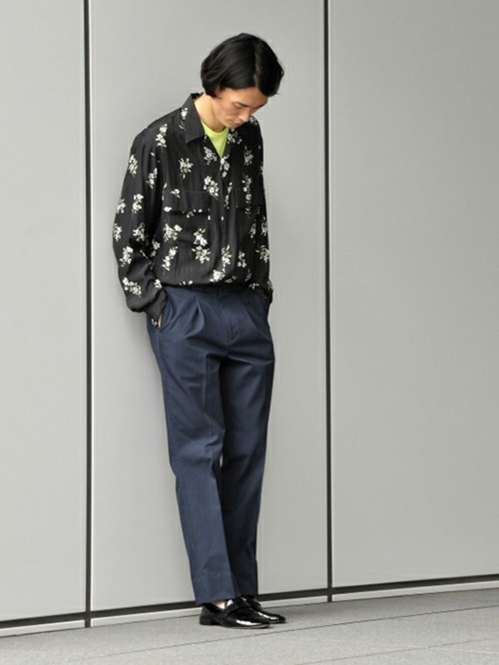 春夏のスタイルでも多かったオープンカラーシャツにクルーネックを合わせる着こなし。シックなスタイリングなので、ビビットなイエローを取り入れるなど、いつもとは違うカラーをチョイス。
