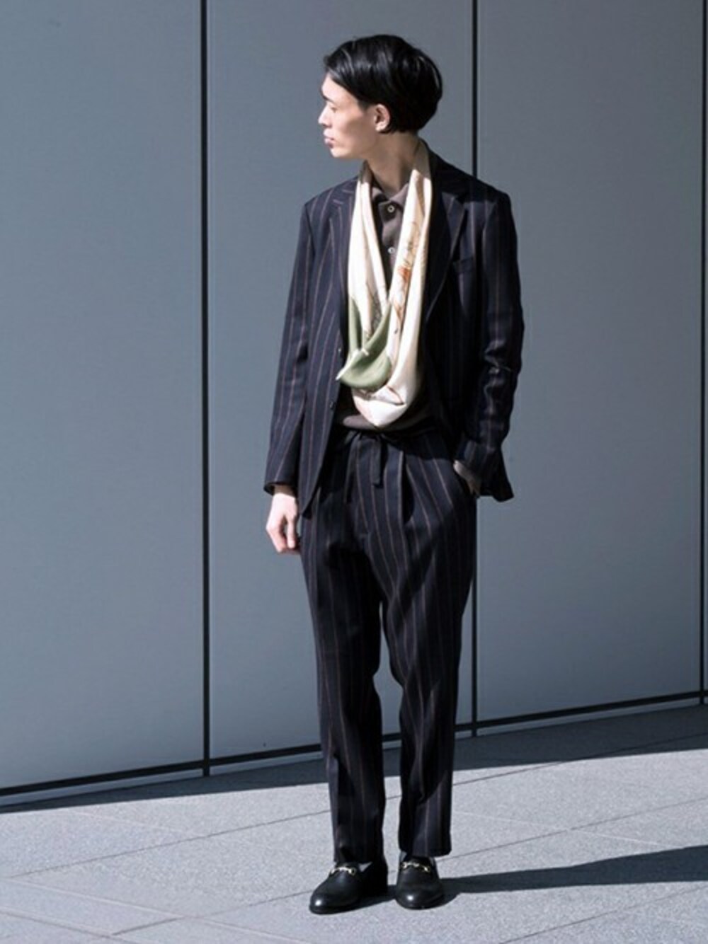 ブラウンのストライプから色を拾い統一感を。スカーフを巻くことでより一層、EDIFICEらしく、エレガントでフレンチ漂うスタイリングの完成です。