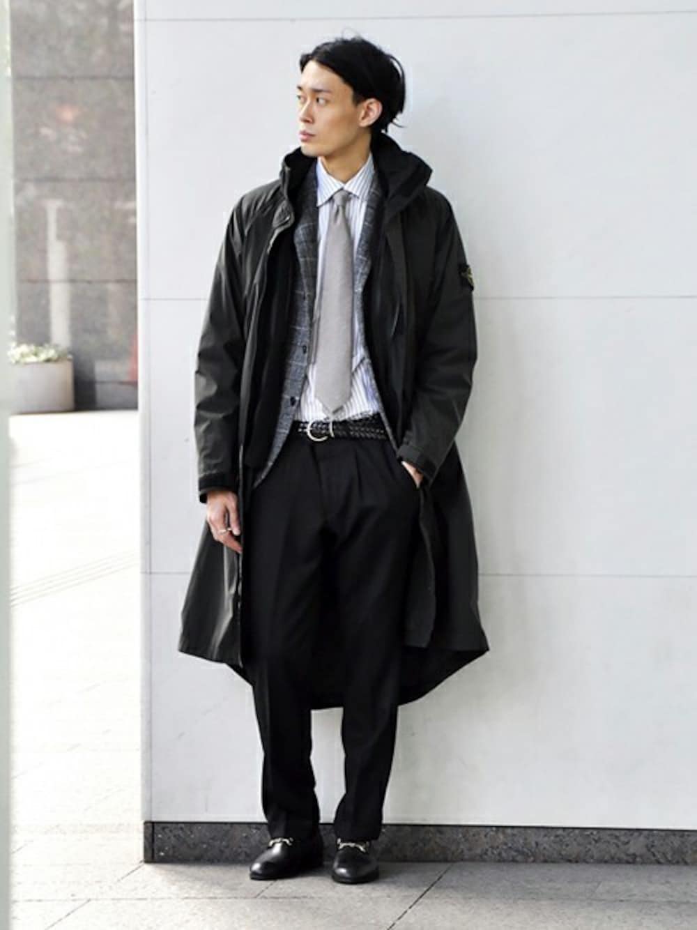 ジャケット×パンツコーデは、ブラックとグレーでカラーを統一し、シックな印象に。今時期には、ジャケットの丈がスマートに隠れるロングコートも欠かせません!