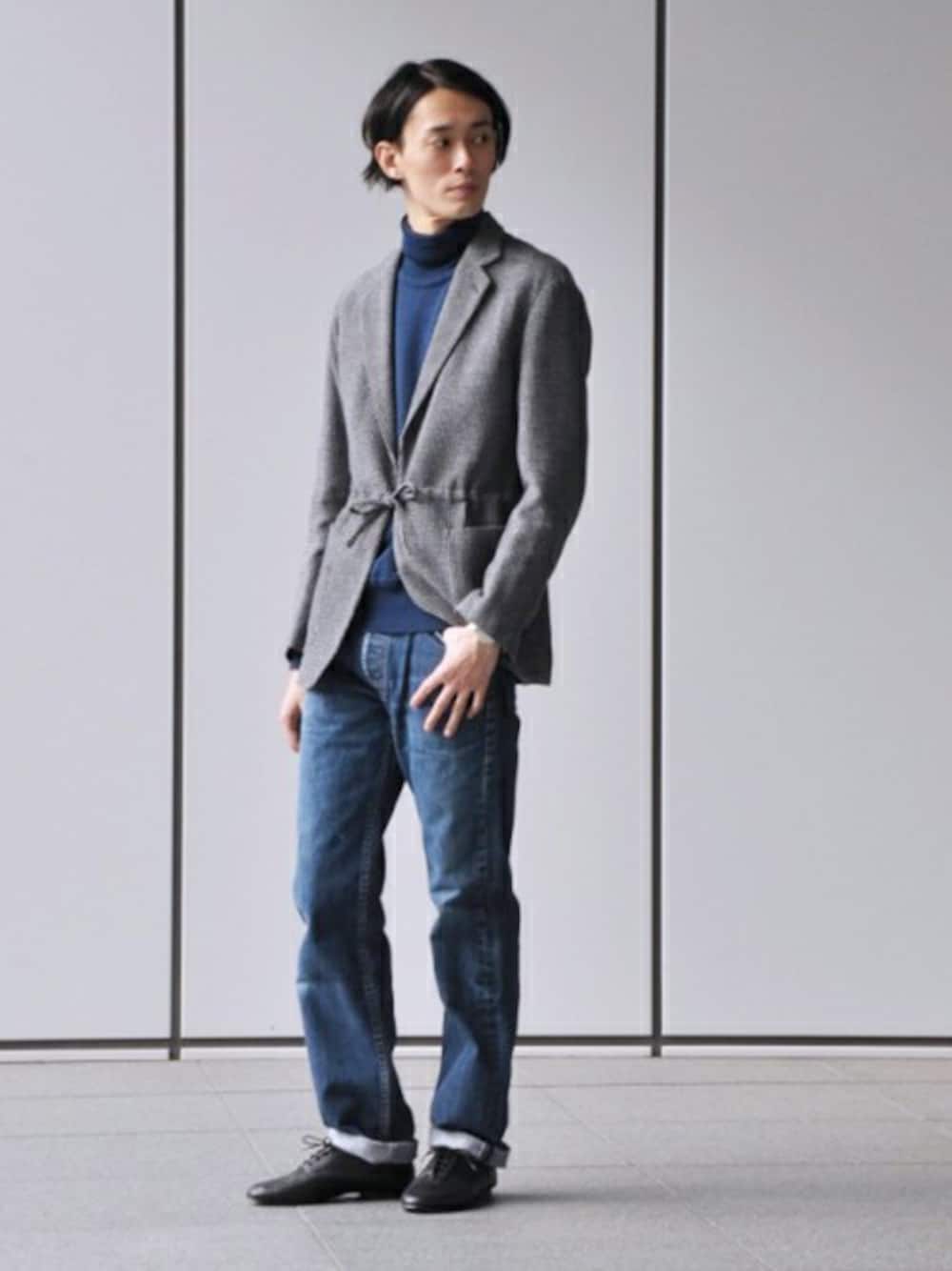 厚すぎない7ゲージニットの仕様は着膨れしづらくインナーとしても着用が可能。トレンドのブリティッシュテイストのジャケットもブルートーンでまとめることでクリーンな仕上がりに。
