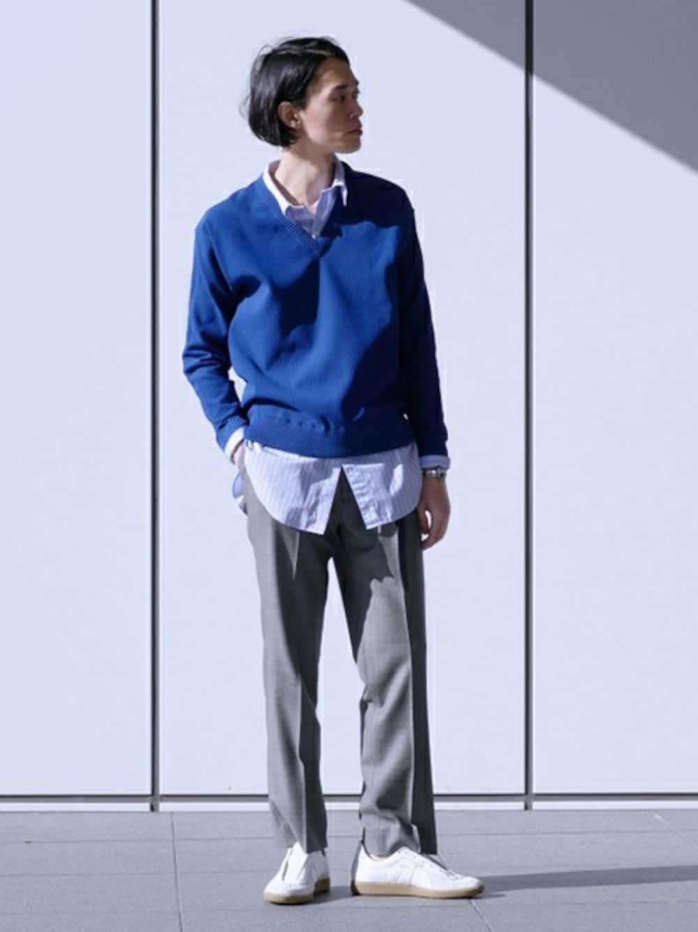 ブリティッシュの要素も取り入れたVネックのニットはリラックス感があり、トラッド過ぎず時代感のあるデザイン。ブルーが目を引くクリーンなスタイリングは一歩先の季節感を演出してくれます!