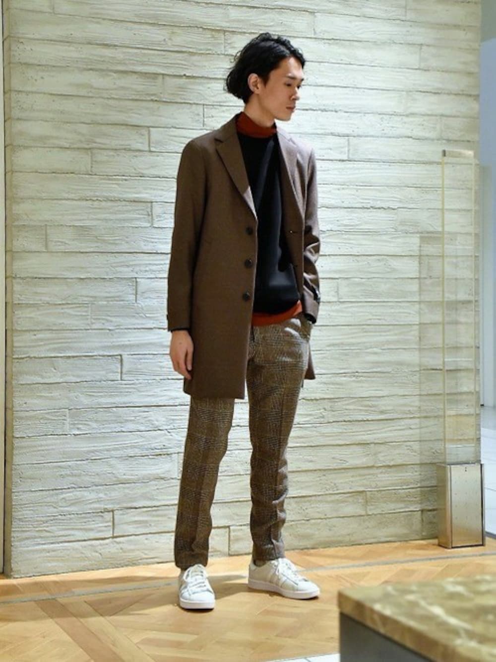 ブリティッシュスポーツスタイル チェスターコートのインナーにはオフタートルのカットソーとスウェットでレイヤードし、足元はスニーカーでまとめることで、上品の中にもスポーティな雰囲気に。