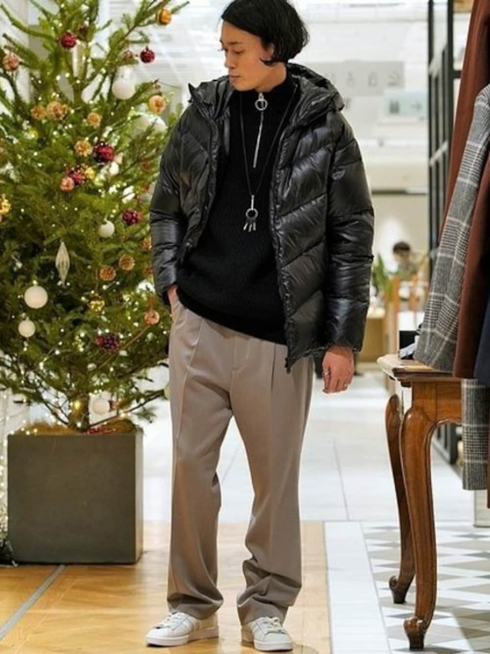 【EDIFICE LA BOUCLE】大人のダウン ビッグシルエットが目を引くデザイン。 ボリュームあるダウンながらも軽い着心地を実現。 大人らしい光沢感のある生地を活かすためスタイリングにはこなれた印象のタック入りスラックス。 色数も抑えることで統一感と落ち着きある印象に。